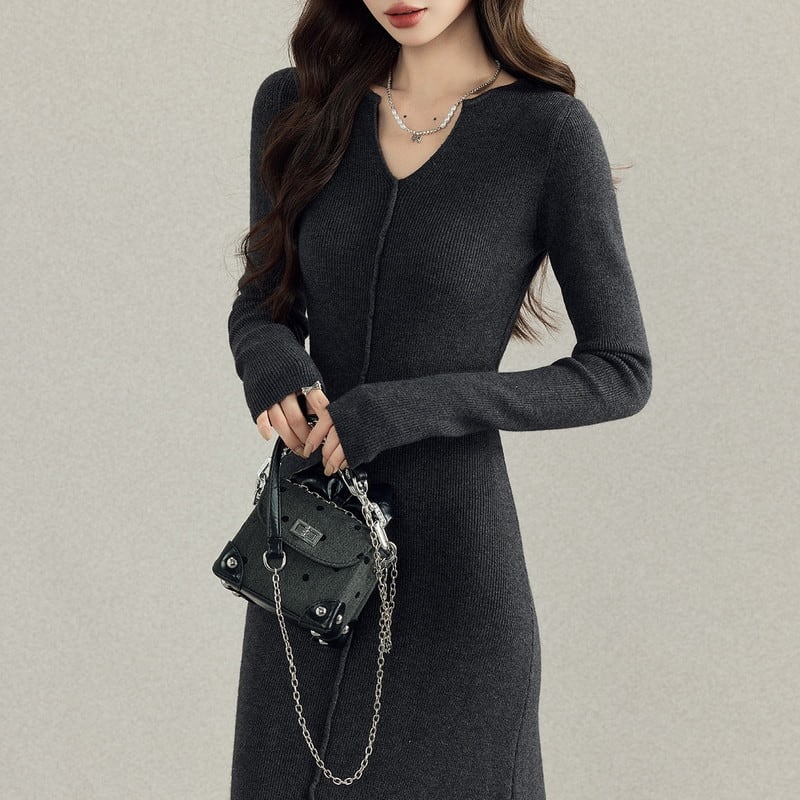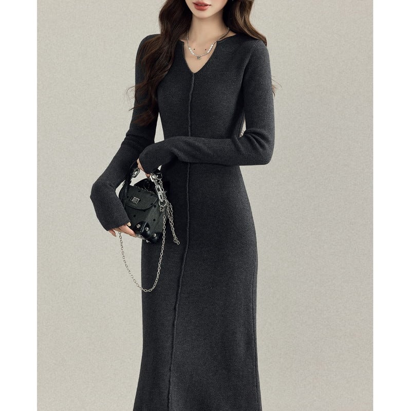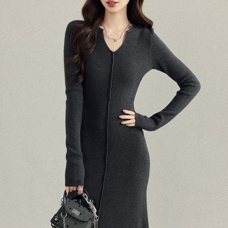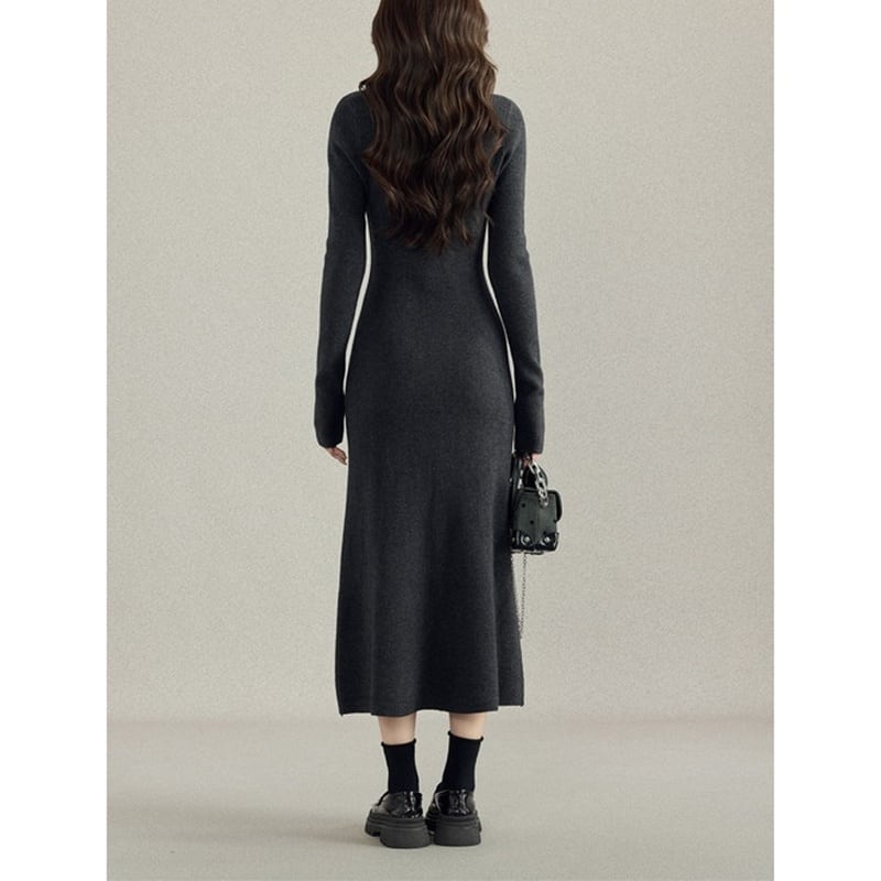 しなやかに縦へ落ちるラインが美しい、Iラインニットワンピースです。
