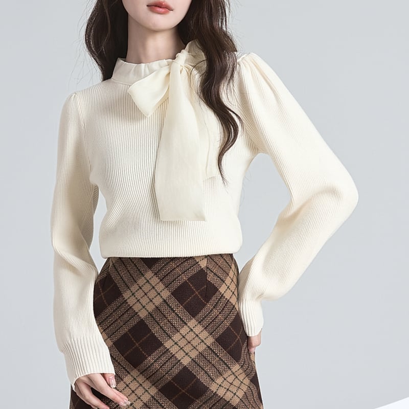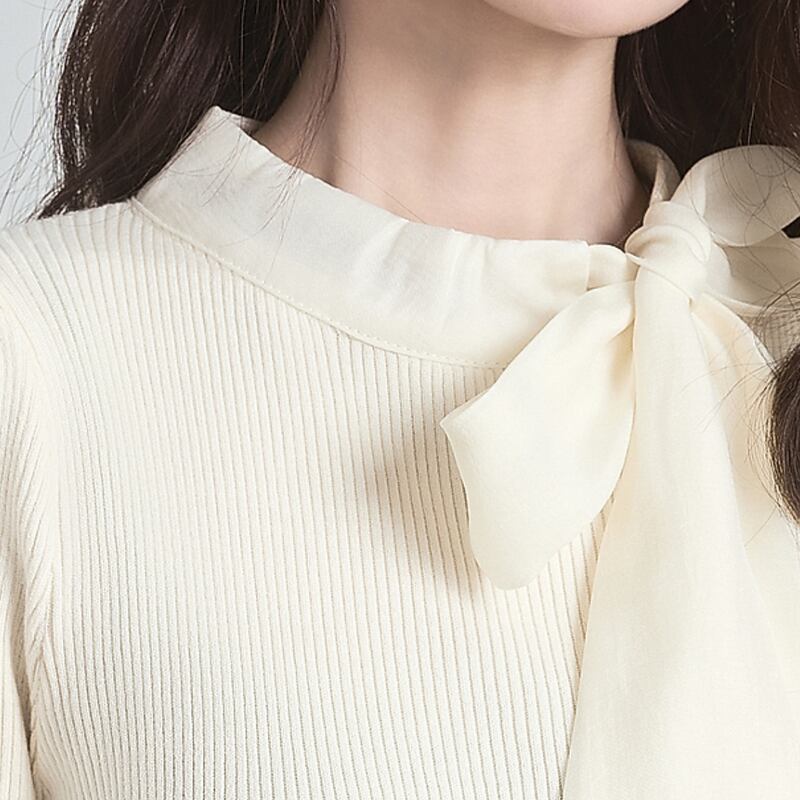 リブ編みが上品な印象を与えるニットカットソー。首元のボウタイがアクセントとなり、フェミニンな雰囲気を演出します。普段使いはもちろん、オフィスやちょっとしたお呼ばれにも活躍します。袖のふんわりとしたシルエットが、女性らしさを引き立てます。