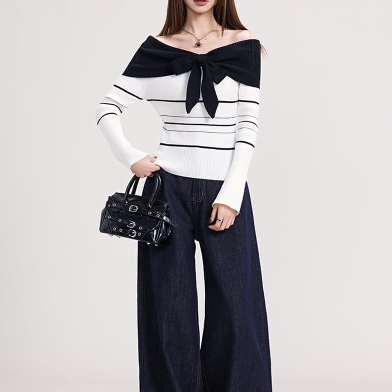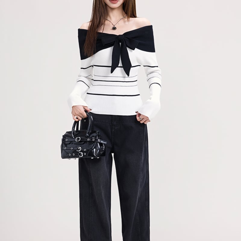 ボーダーリボンがアクセントの長袖ニット。デコルテを美しく見せるオフショルダーデザインで、普段使いはもちろん、少しドレッシーなシーンにも活躍します。シンプルなボトムスと合わせれば、洗練された大人の着こなしが完成。