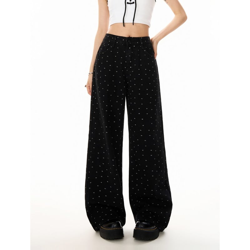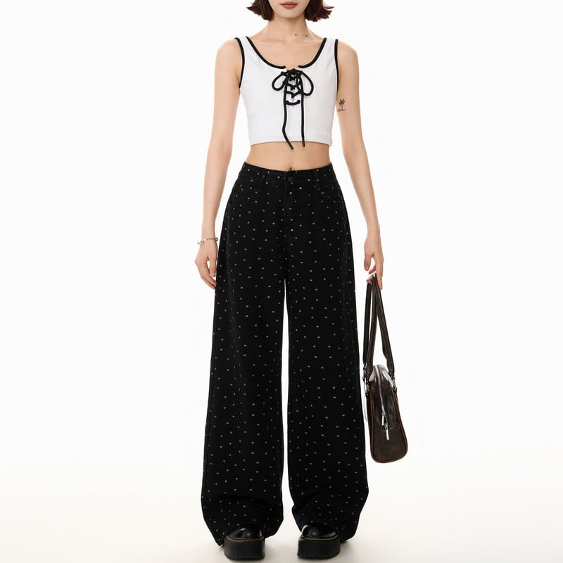 小さなドット柄がさりげなく映えるドットワイドリラックスパンツです。
