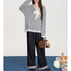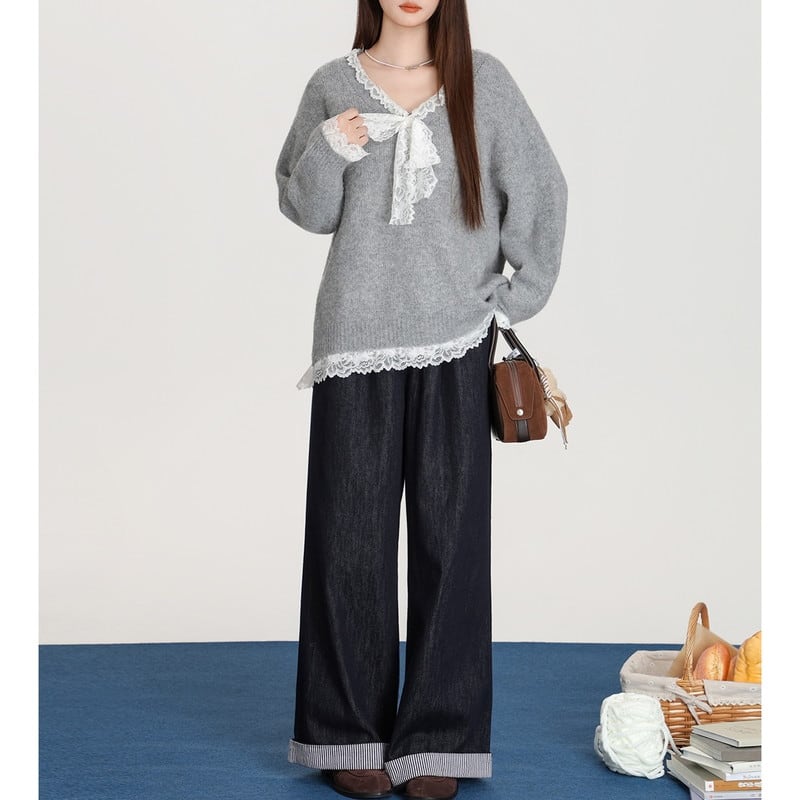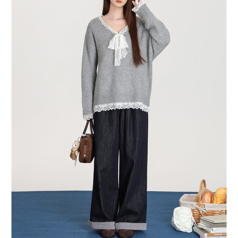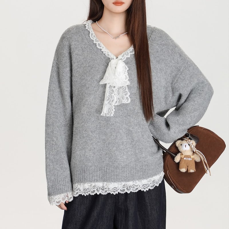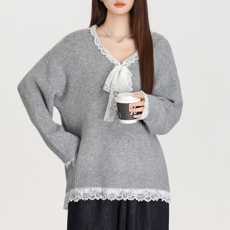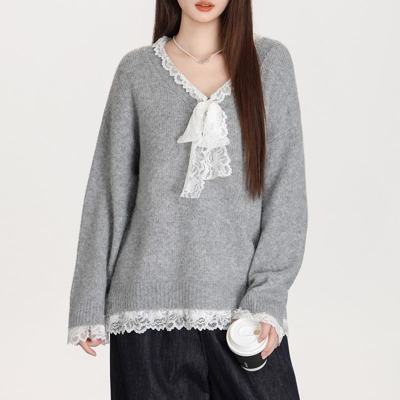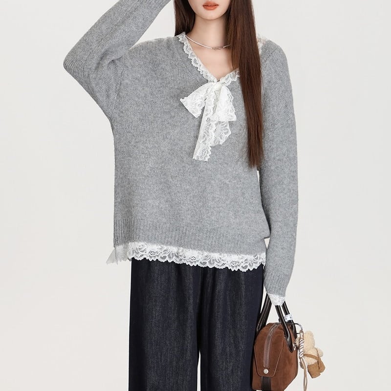 lace-ribbon v-neck long knit pullover m1323
