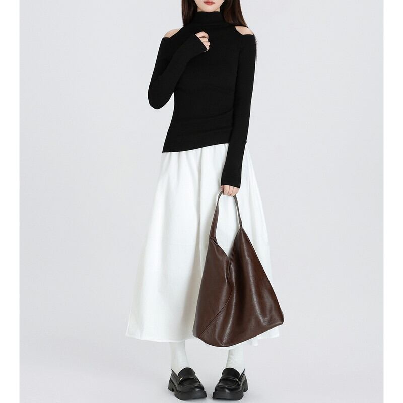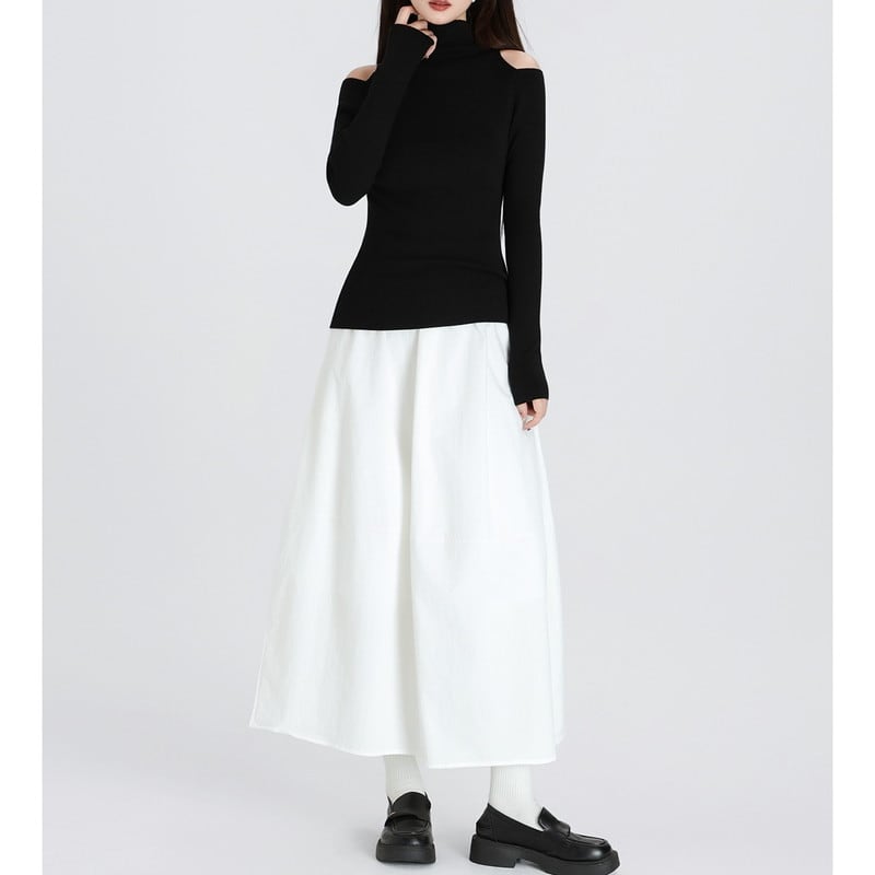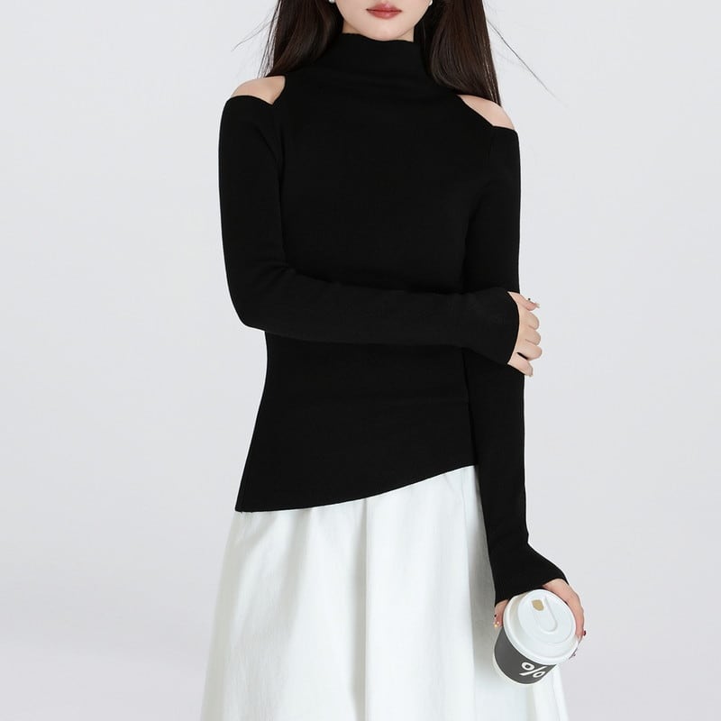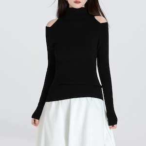 さりげない肌見せが可愛い肩あきハイネックニットトップスです。