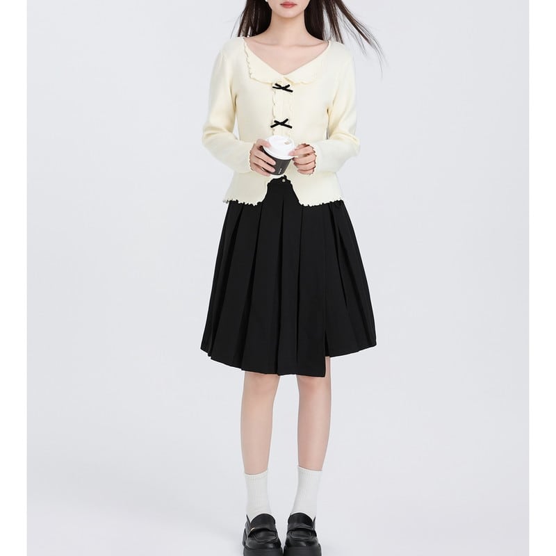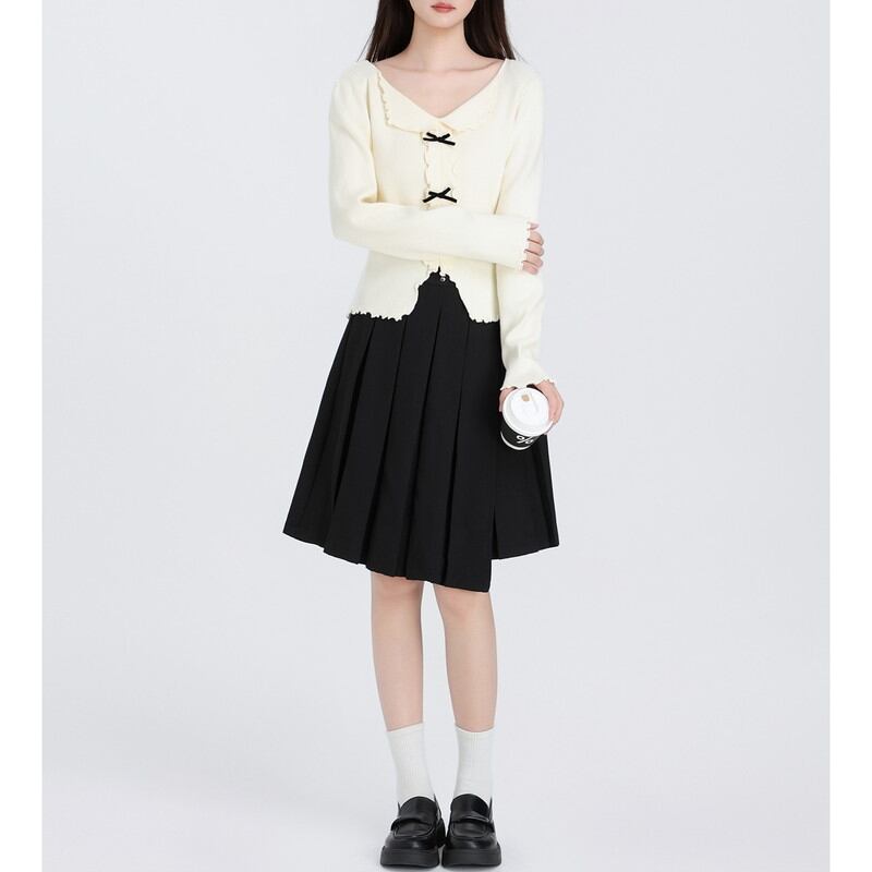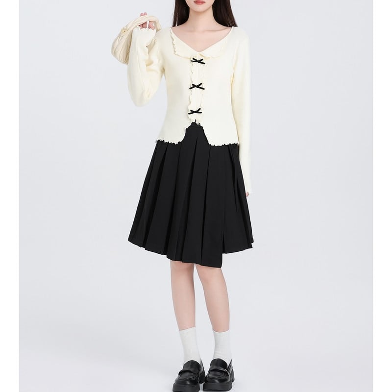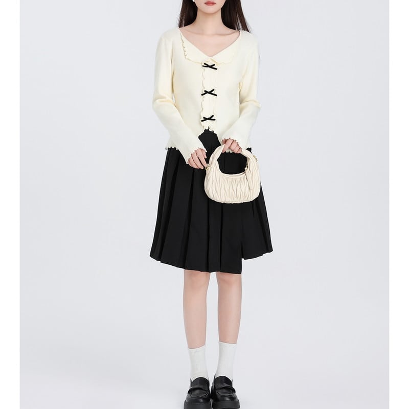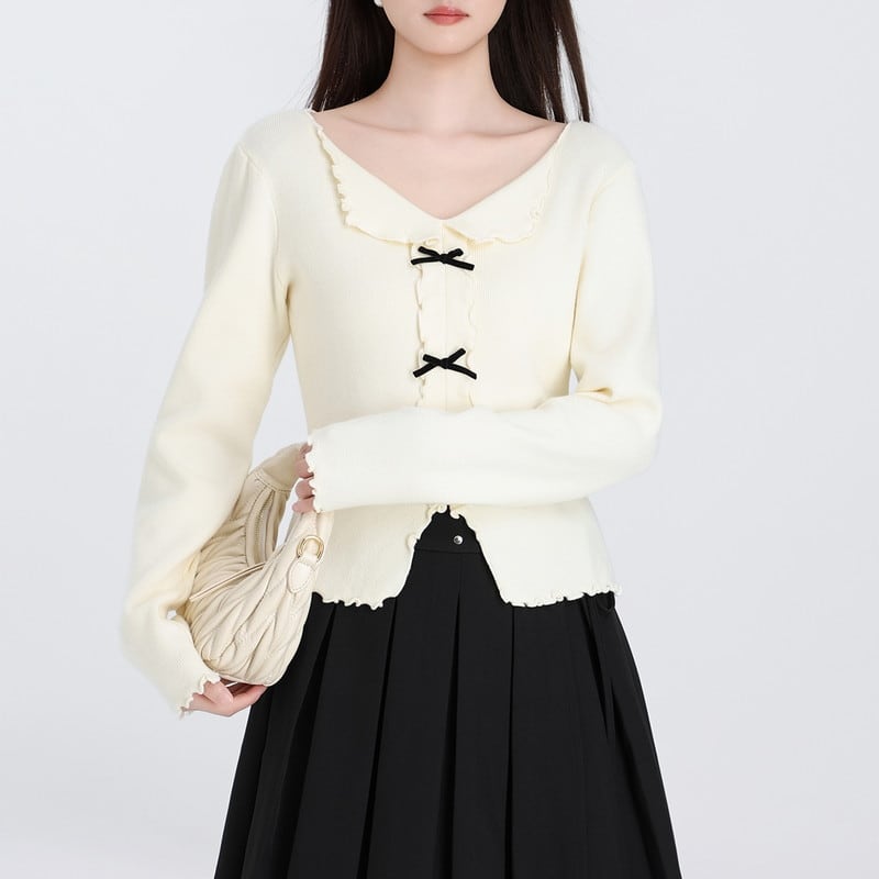 フロントの小さめリボンがほどよく甘さを添えて、Vネックのラインが顔まわりをすっきり見せてくれます。