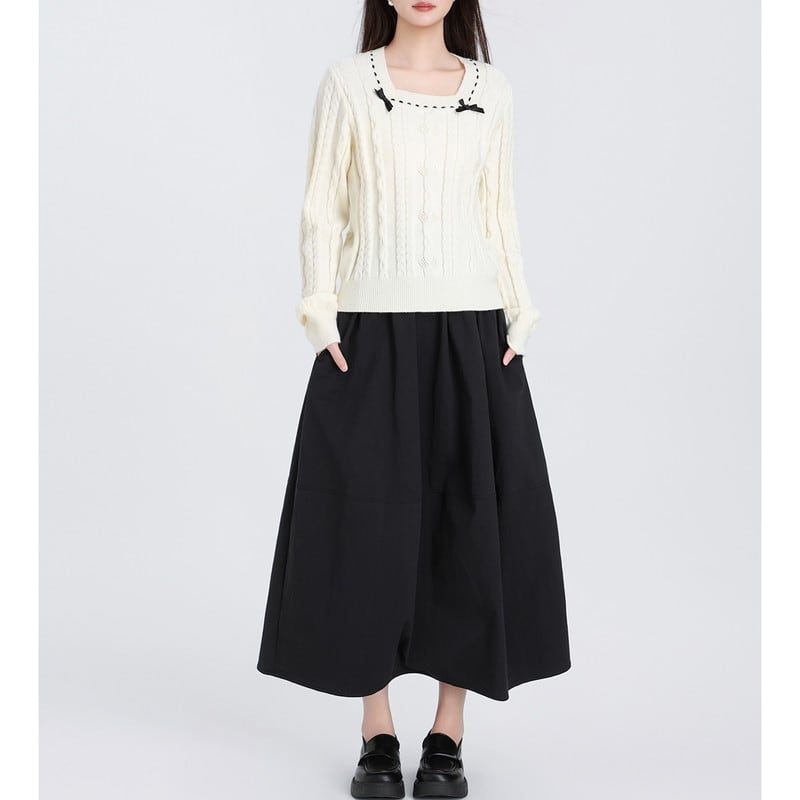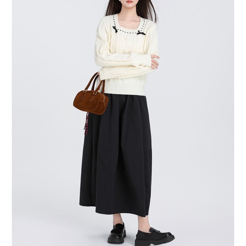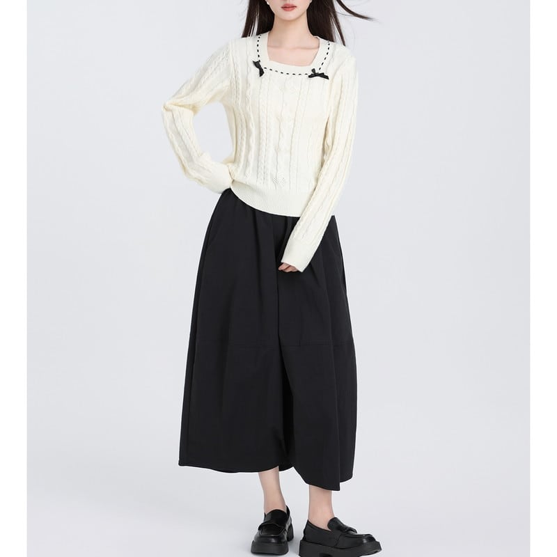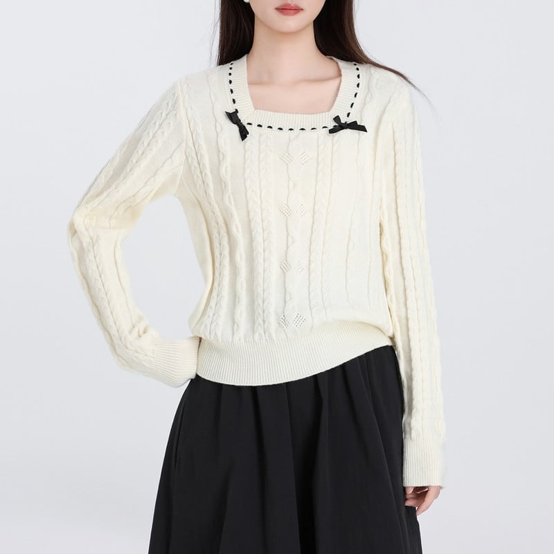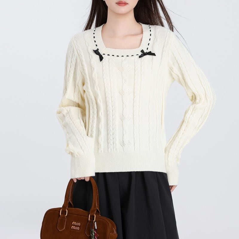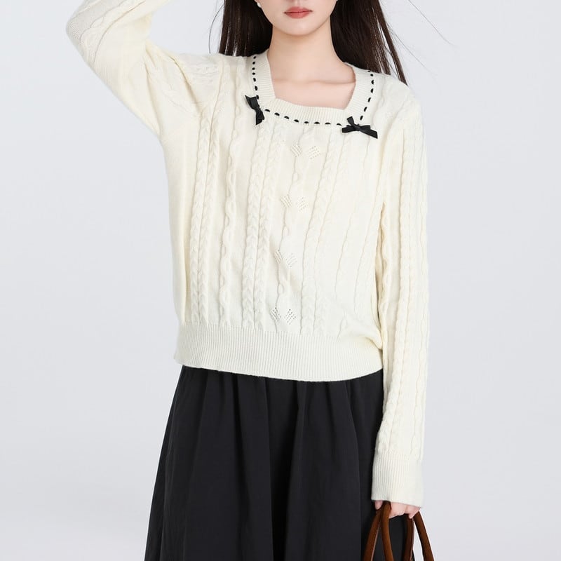 スクエアネックに並ぶ小さなリボンがさりげなく甘さを添え、編み模様が立体感を引き出します。