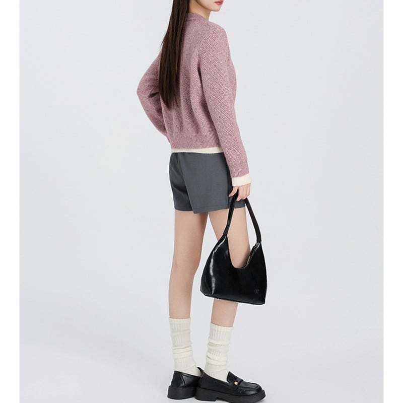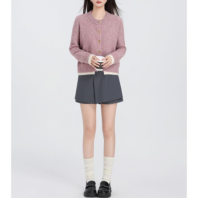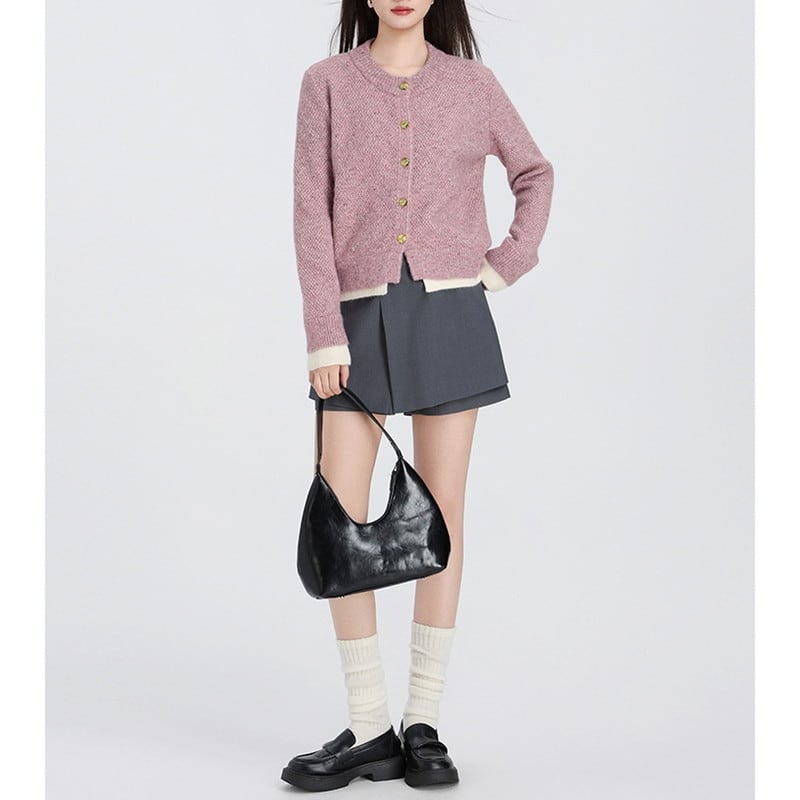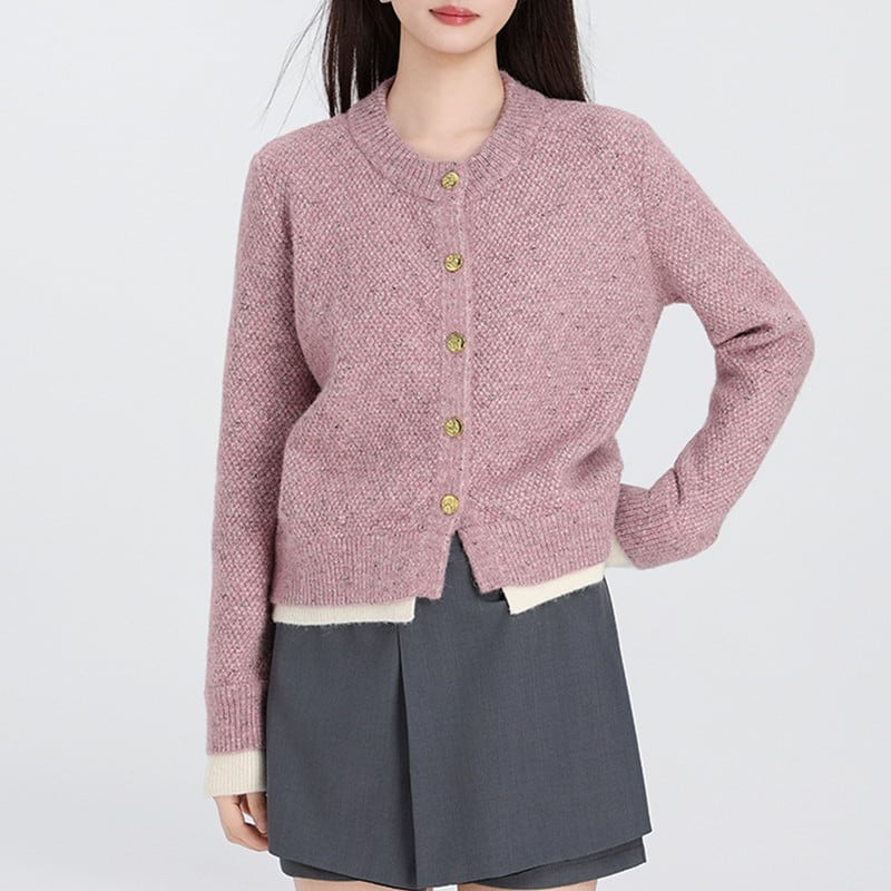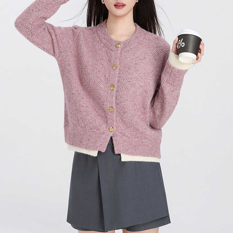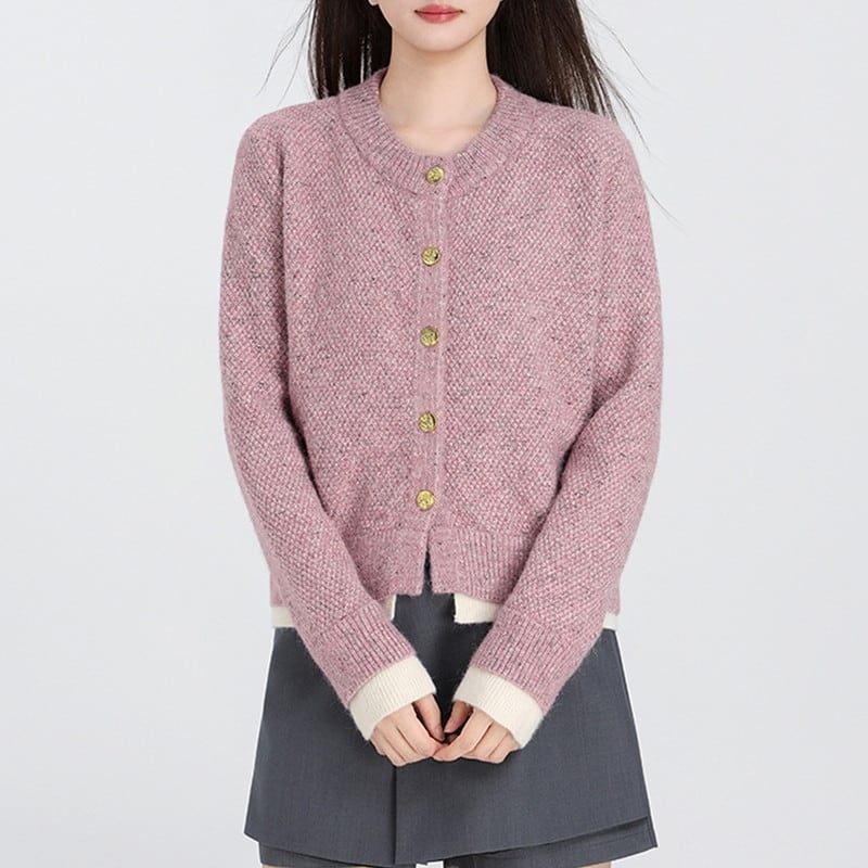 ゴールドボタンが上品に映え、シンプルながら表情のある編地が魅力です。