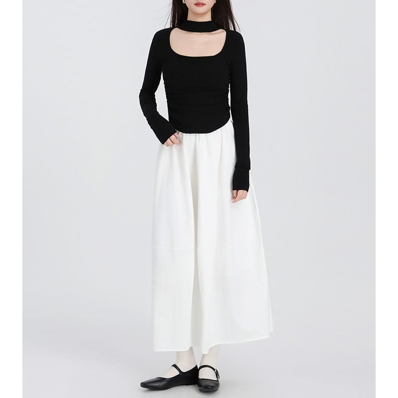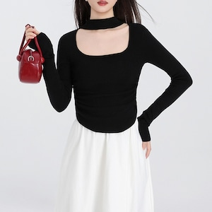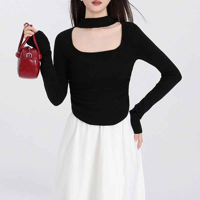 首元のチョーカー風カッティングがさりげなく個性を添えて、シンプルな装いに表情をプラス。