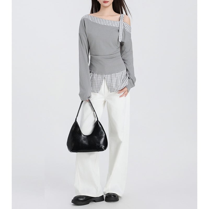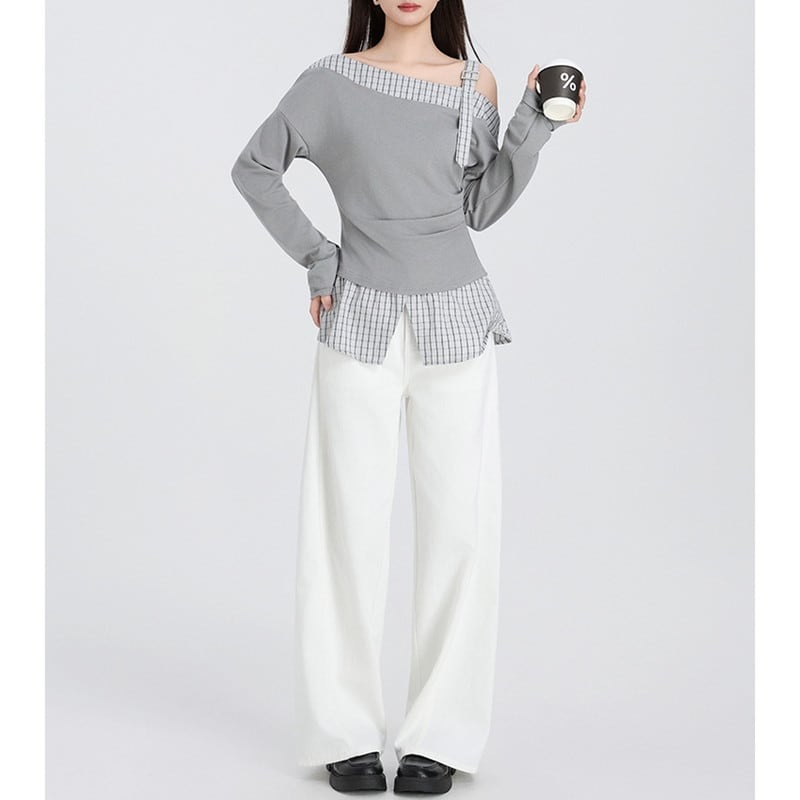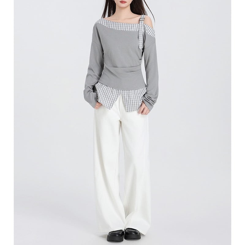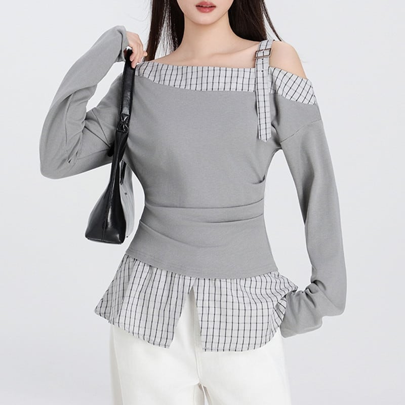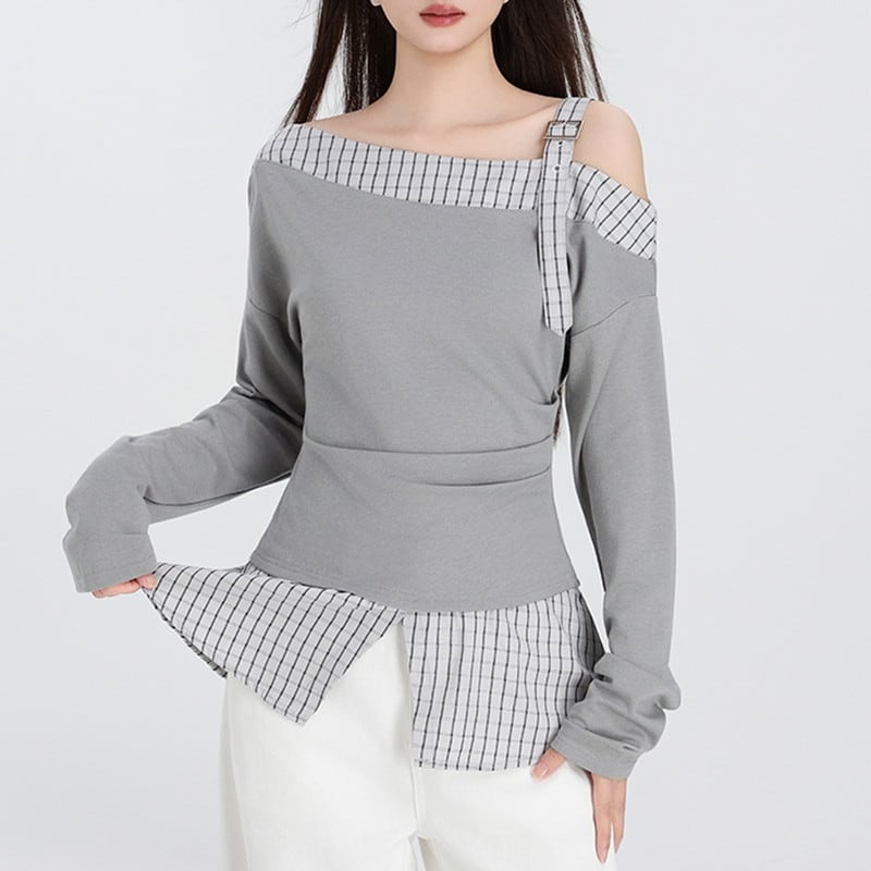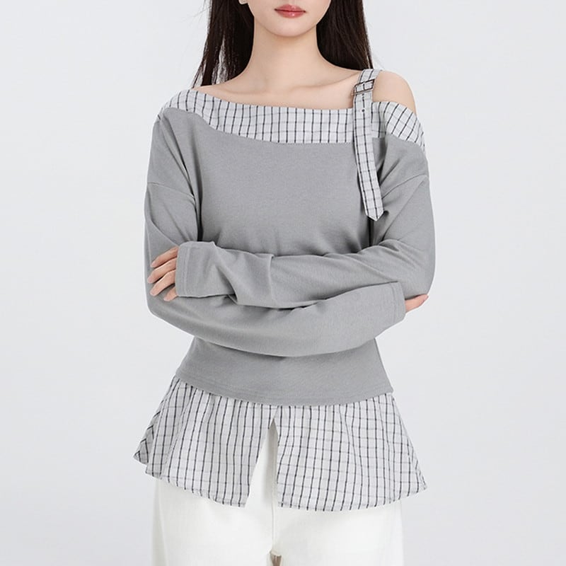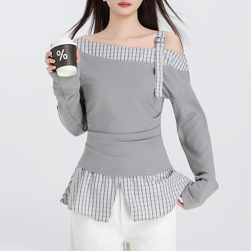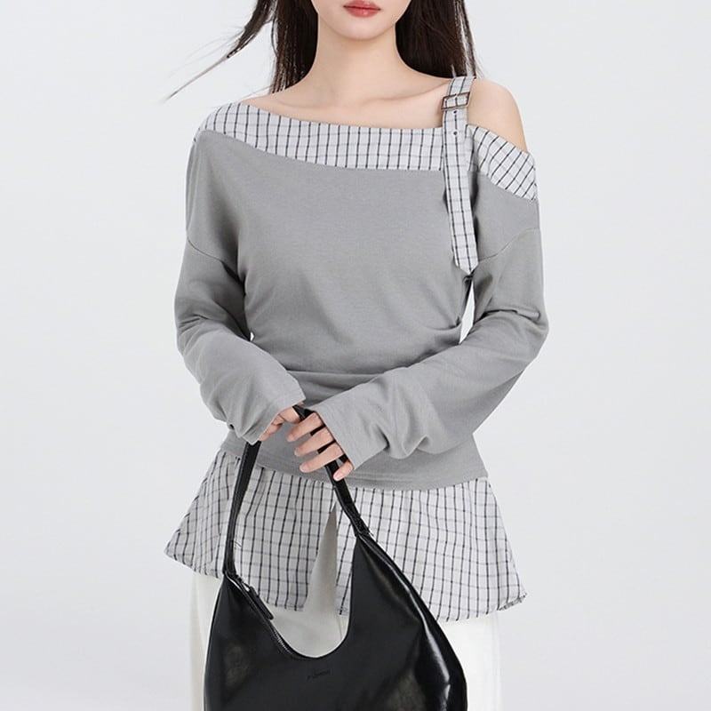 one-shoulder checked belt flare tops m1357