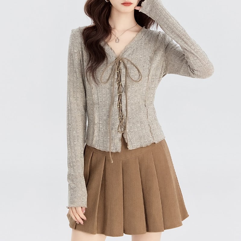 胸元のレースアップが印象的なレースアップリブトップスです。