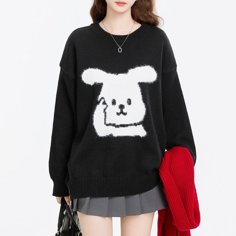 愛らしいドッグモチーフが目を引く、遊び心のあるニットトップスです。
