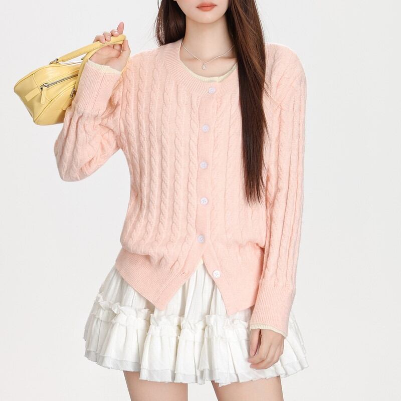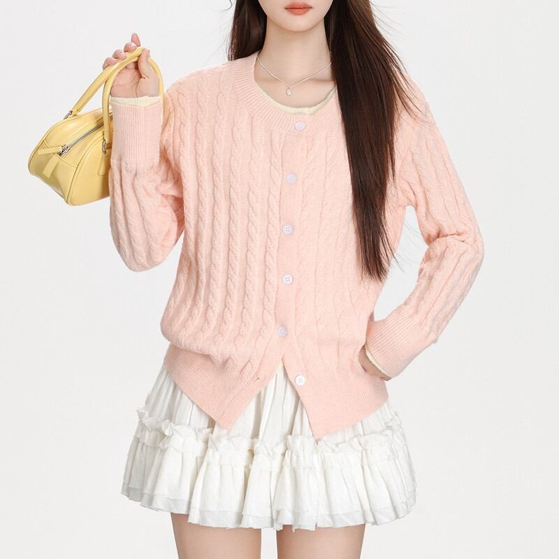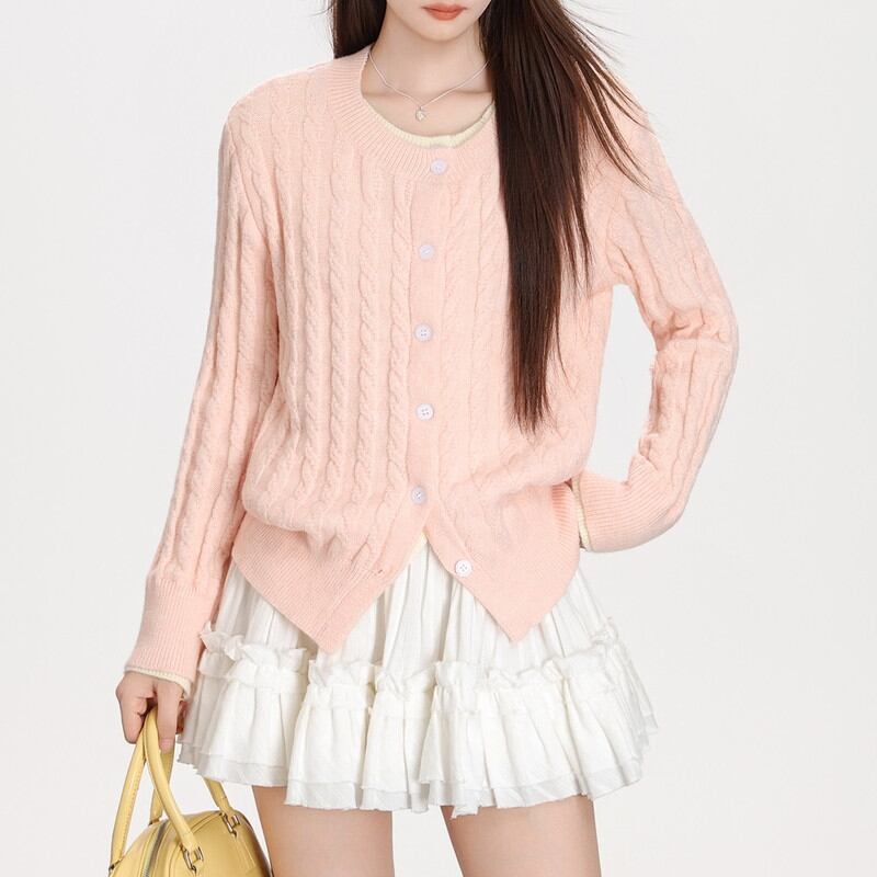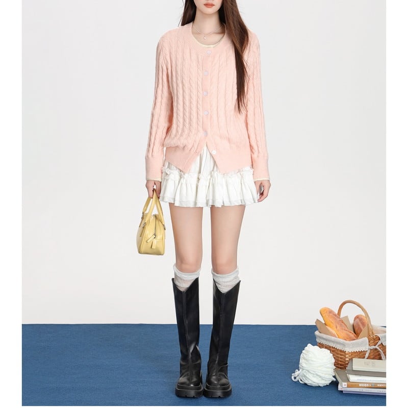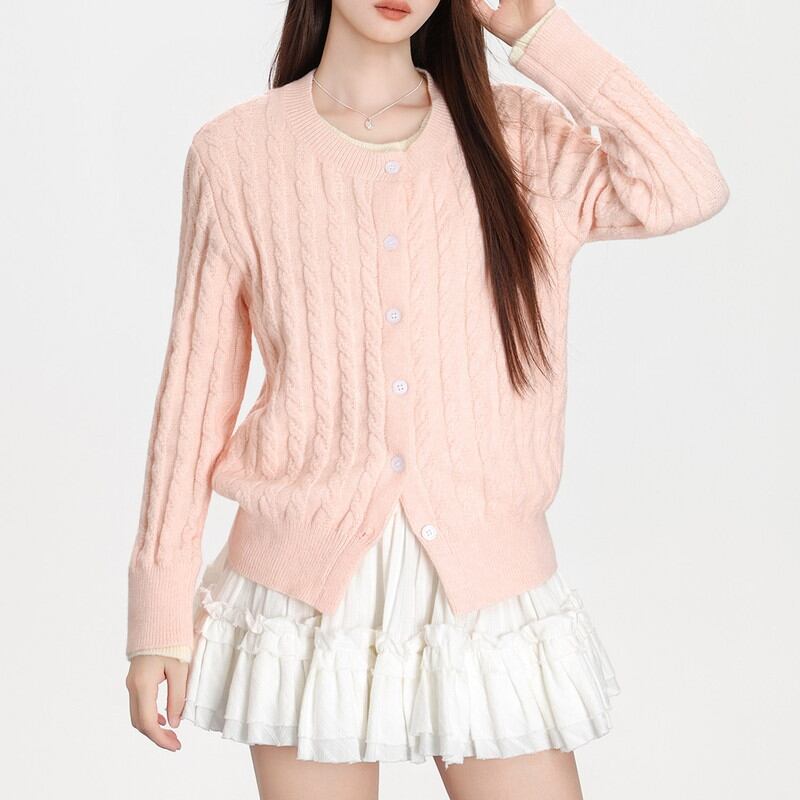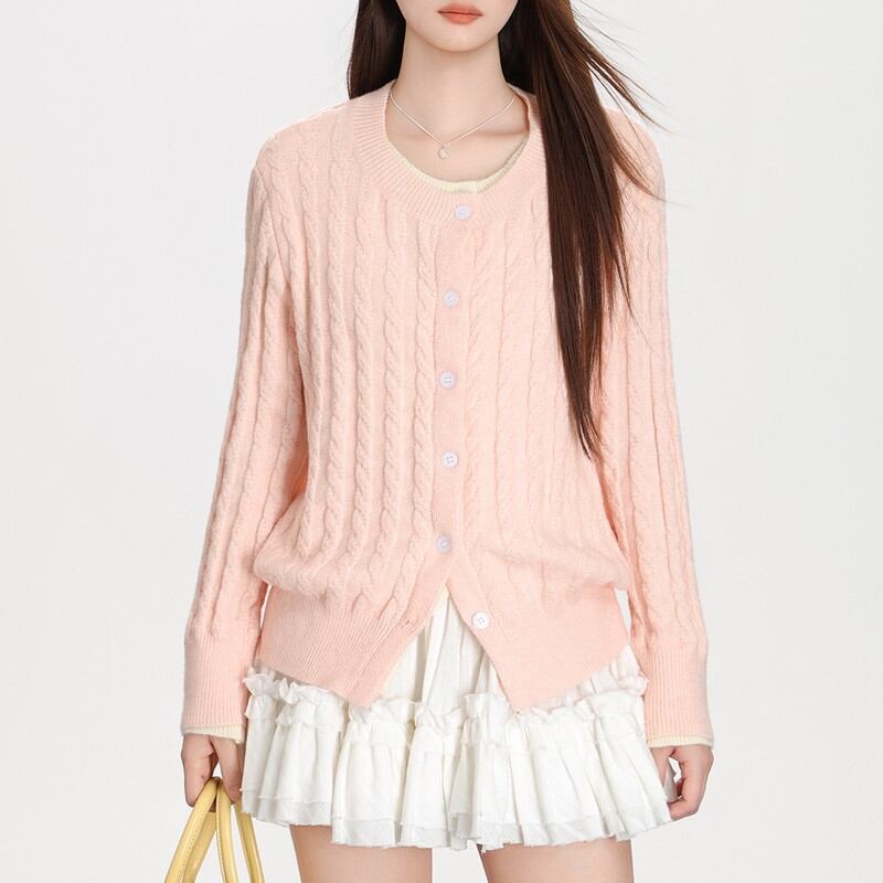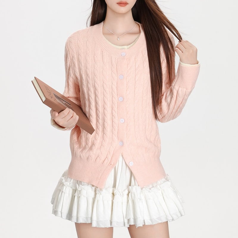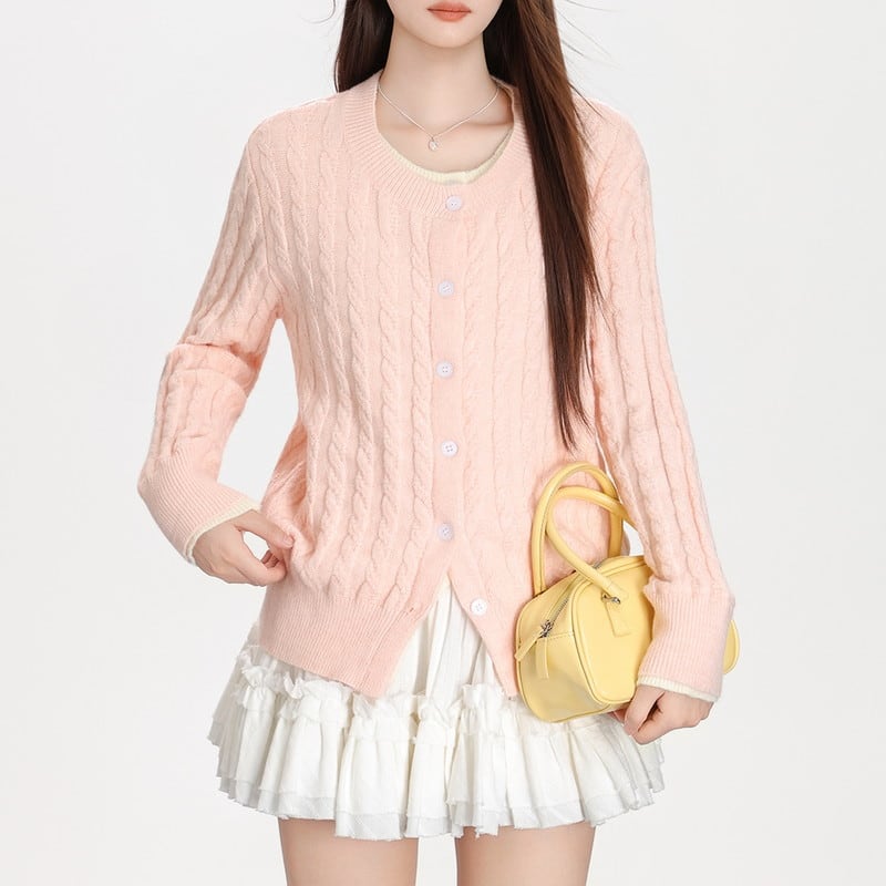 やさしい表情のケーブル編みが印象的なケーブル編みラウンドカーデです。