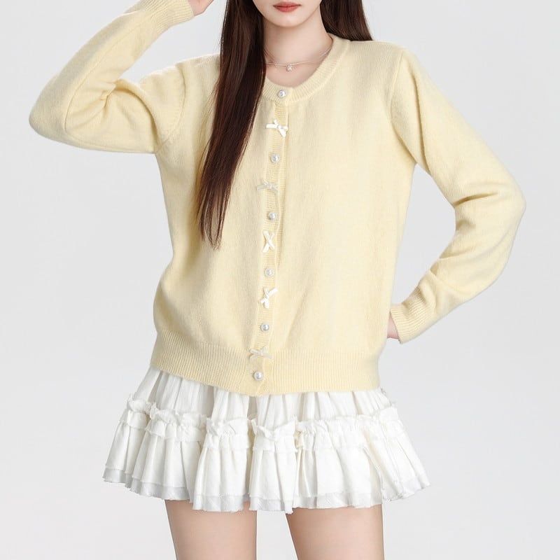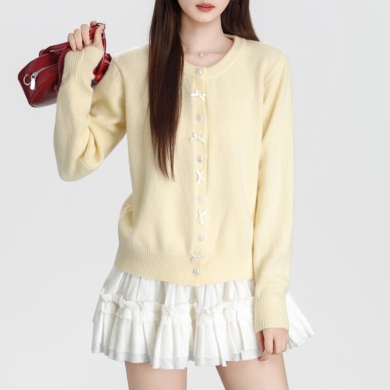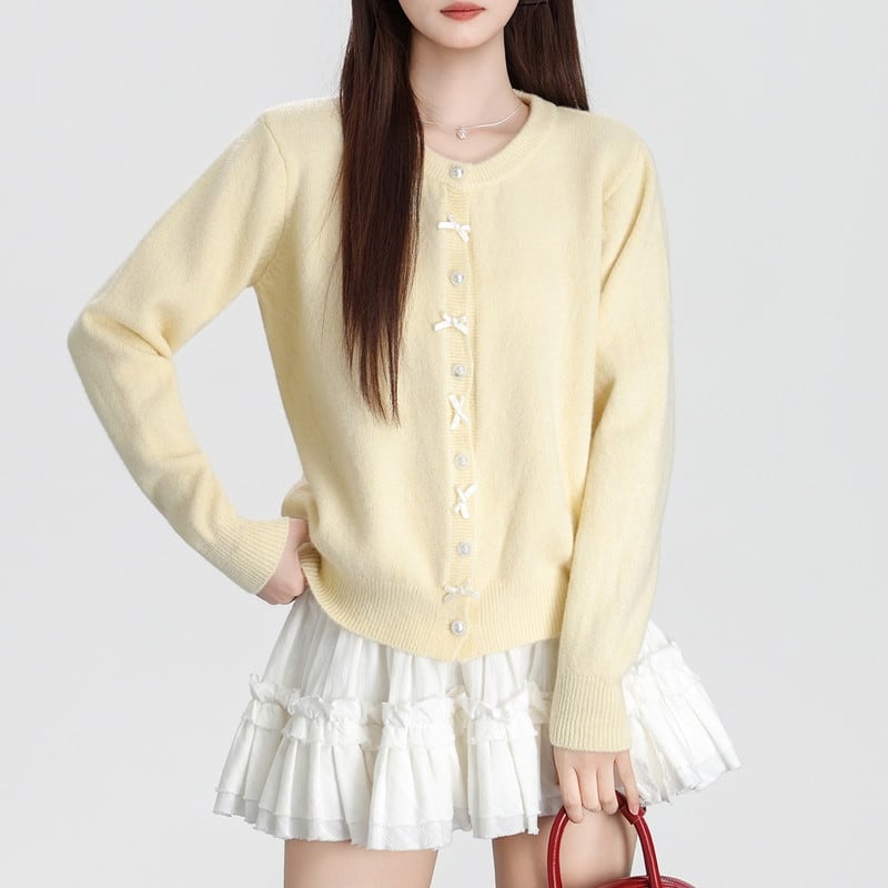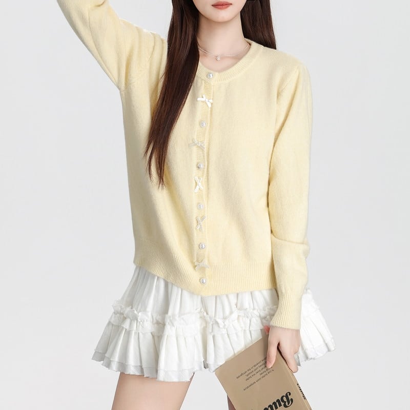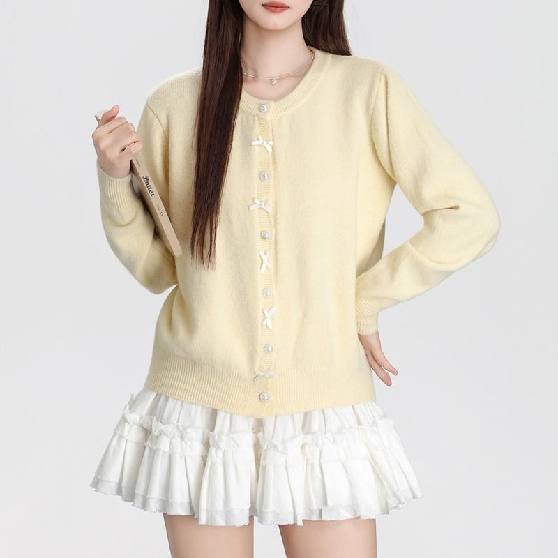 ribbon pearl-button round-neck knit cardigan m1504