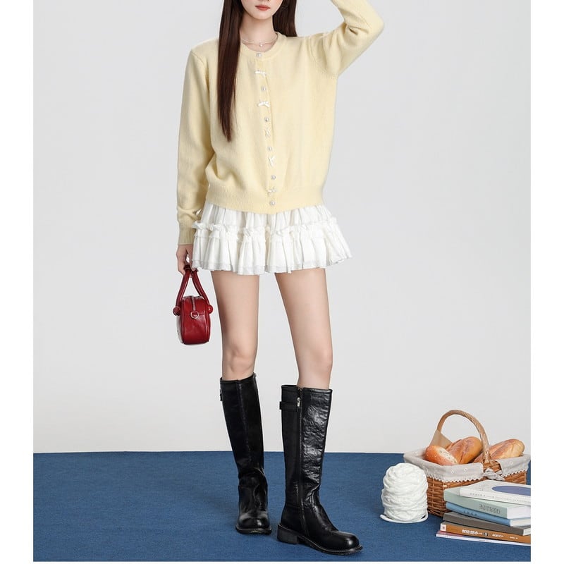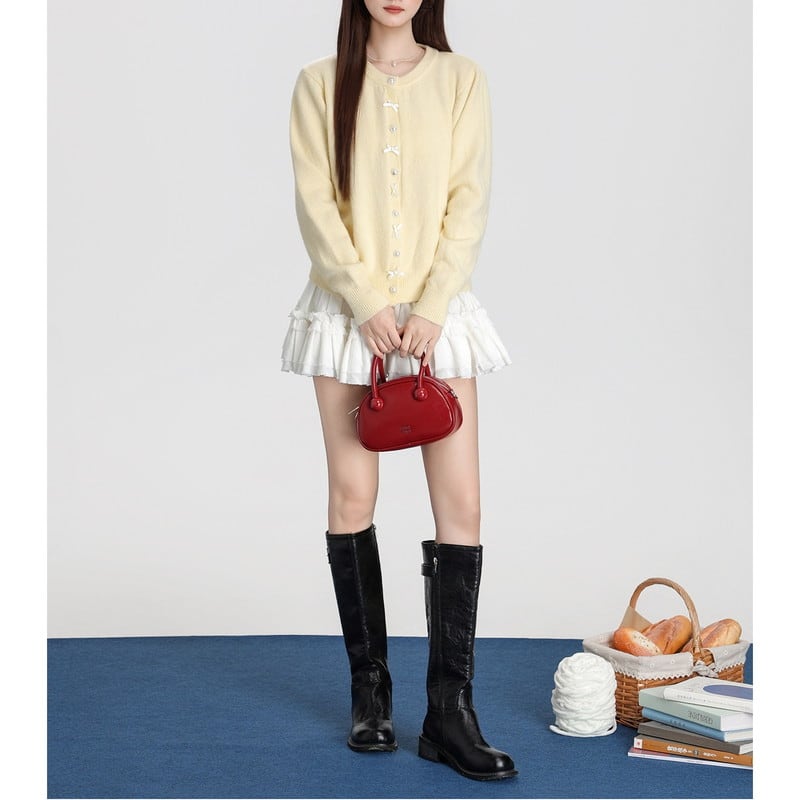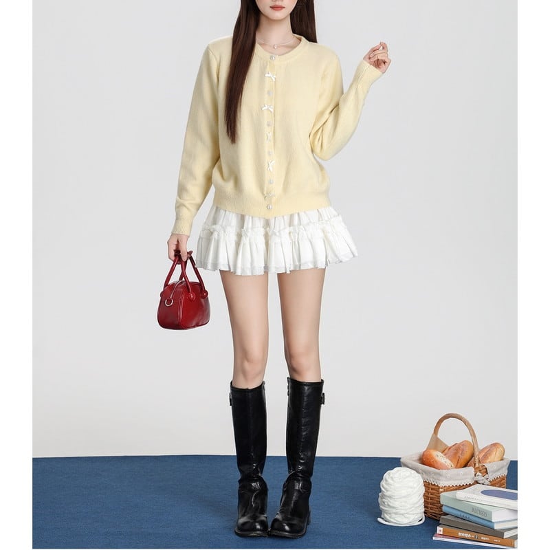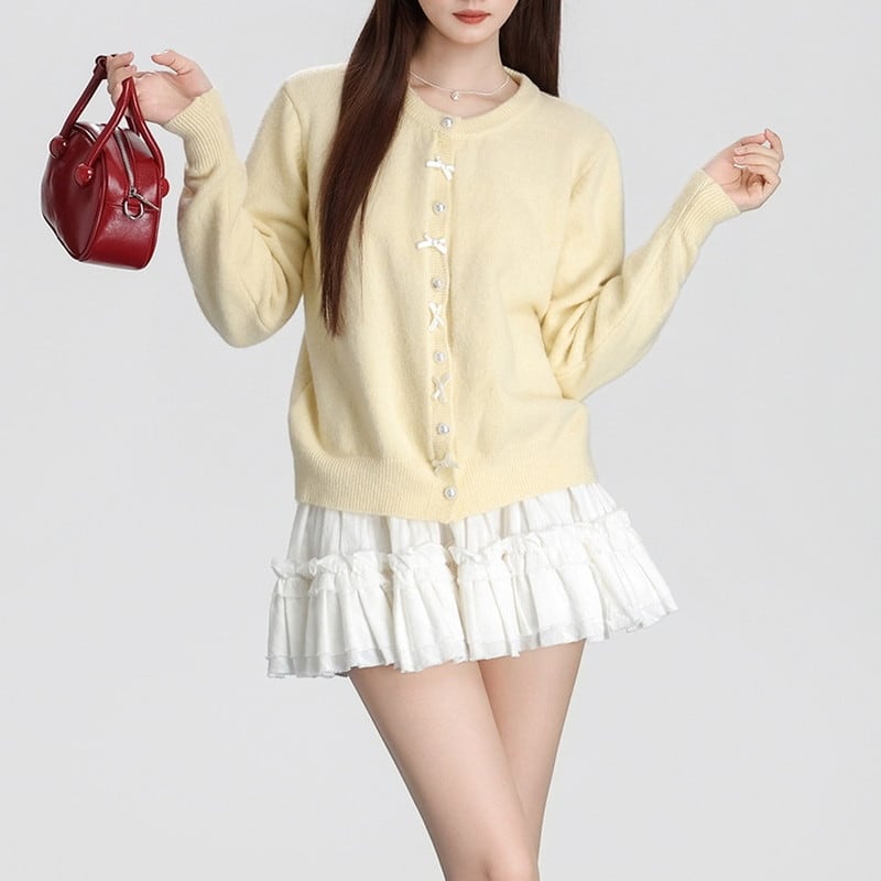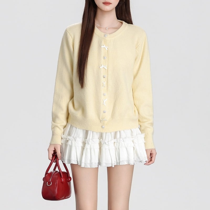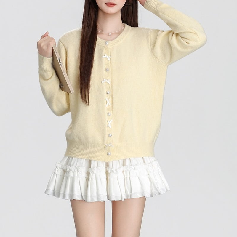 ribbon pearl-button round-neck knit cardigan m1504