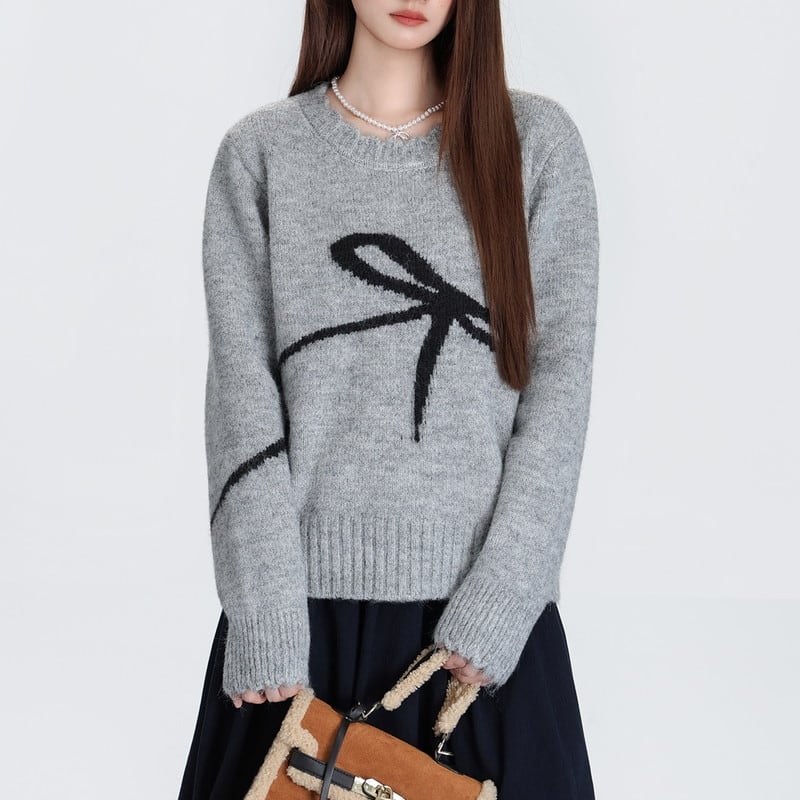 存在感のある柄が目を引くリボンモチーフニットトップスです。