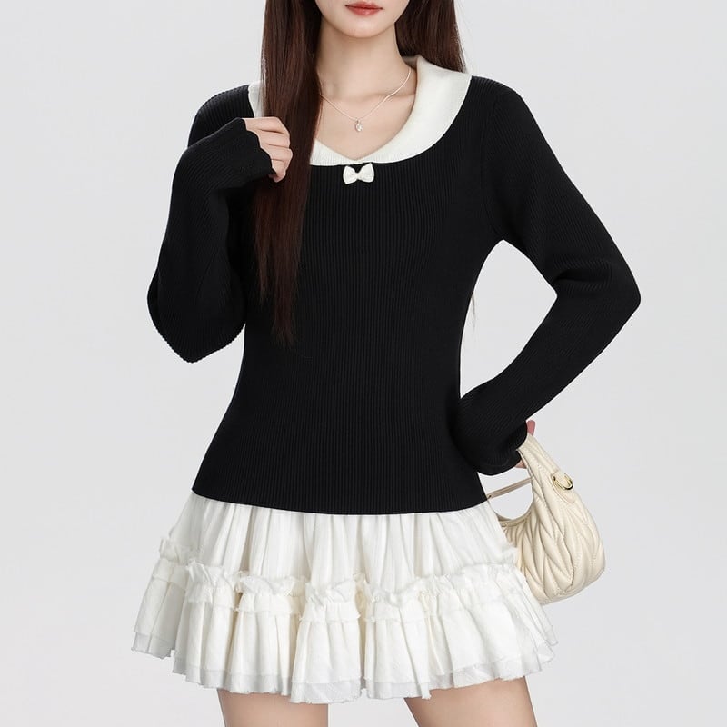 chic bi-color ribbon-collar knit m1506