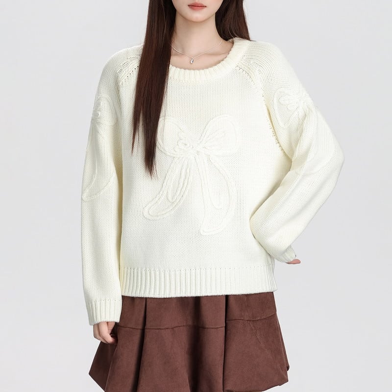 やさしく映えるリボンモチーフニットトップスです。