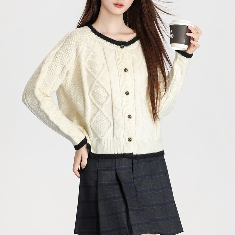 上品な配色が映える配色ラインケーブルニットカーディガンです。