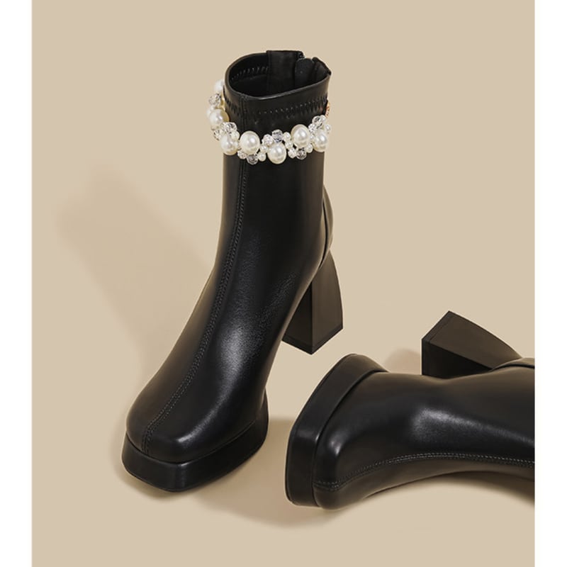 足元を華やかに彩るショートブーツです。履き口にあしらわれたパールが、上品な印象を与えます。安定感のあるプラットフォームと太めのヒールで、スタイルアップ効果も期待できます。普段使いにはもちろん、パーティーシーンにもおすすめです。