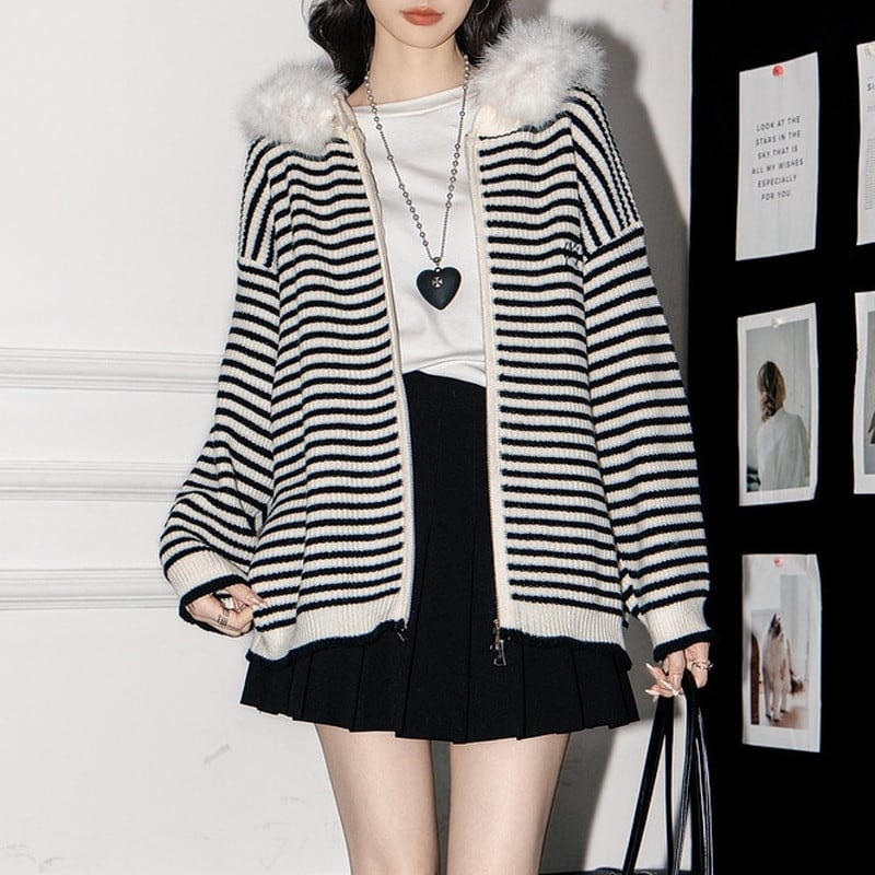 カジュアル感と可愛さを両立したボーダーフードニットカーディガンです。