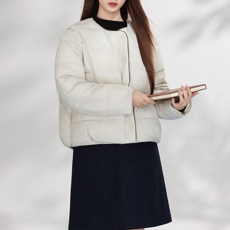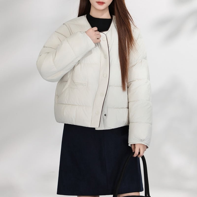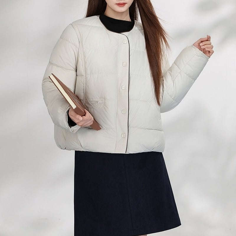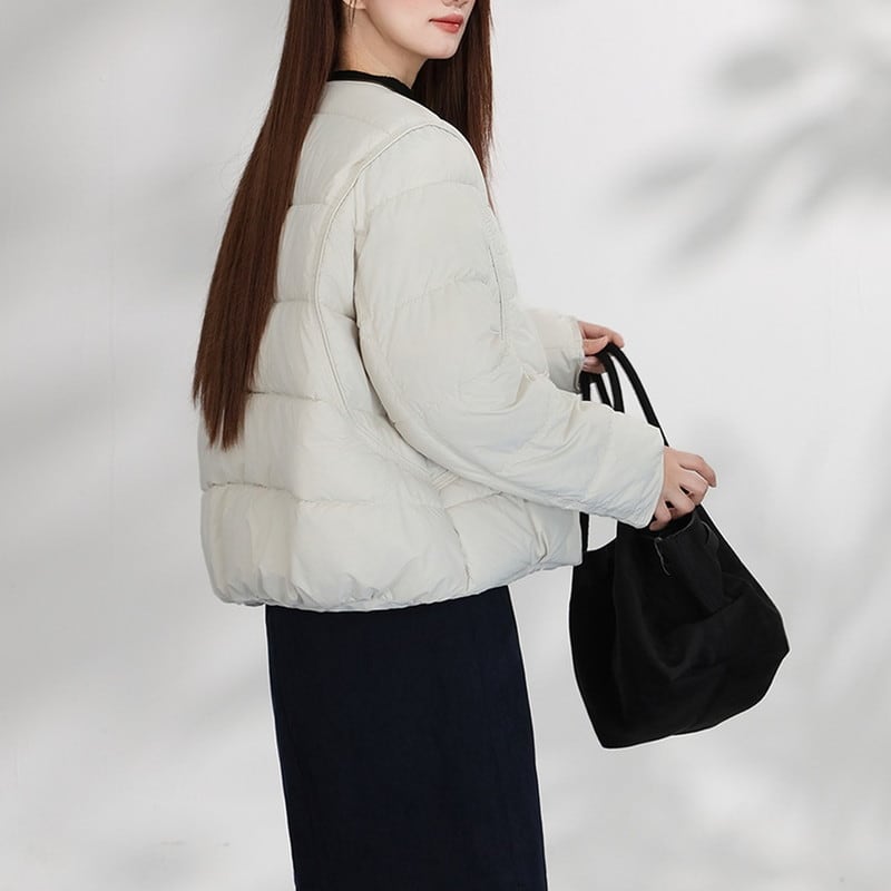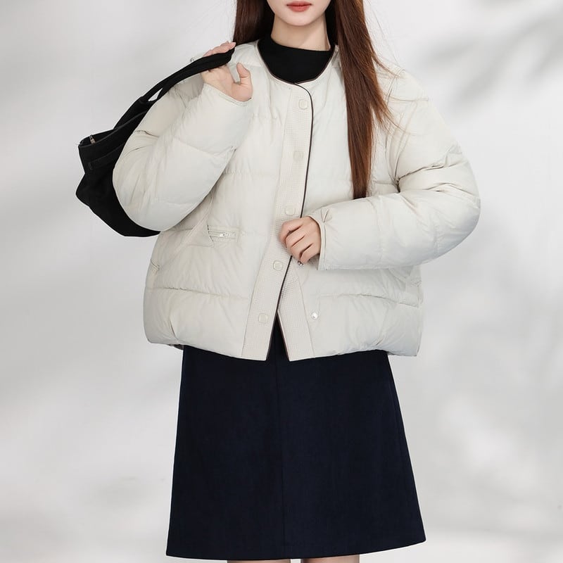 丸みのあるボリューム感が可愛い、ノーカラー中綿ジャケットです。