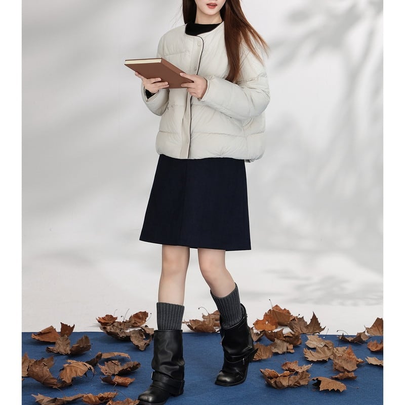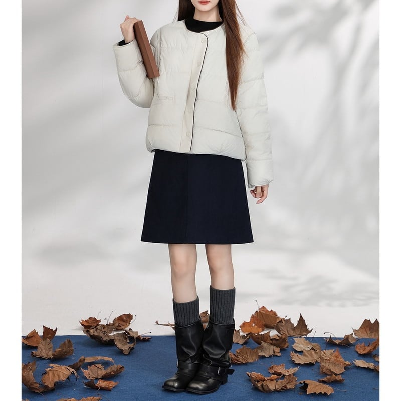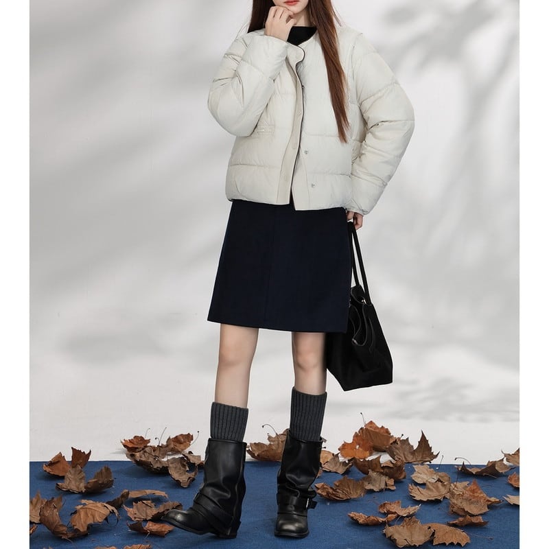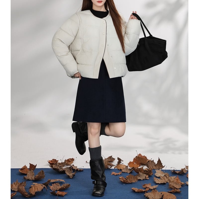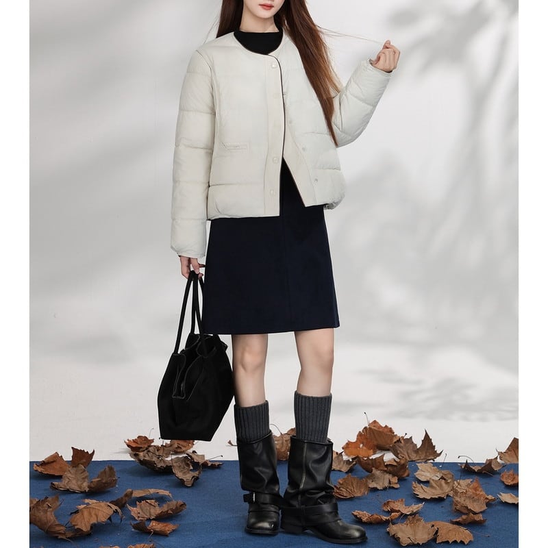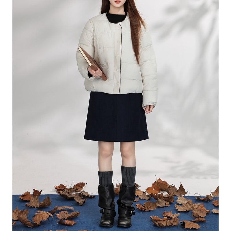 丸みのあるボリューム感が可愛い、ノーカラー中綿ジャケットです。