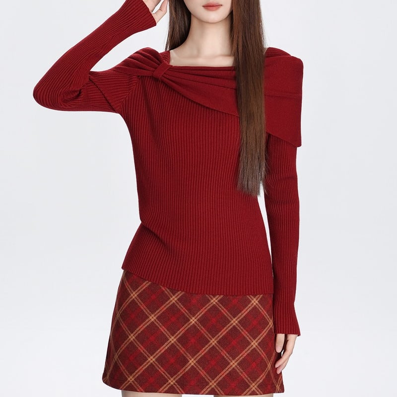 肩まわりのリボン風デザインが印象的な、存在感のあるニットトップスです。
