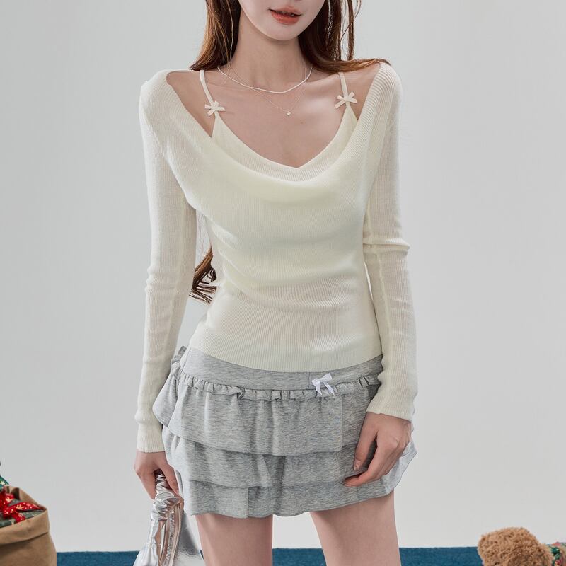 off-shoulder long sleeve knit cut and sew m1591