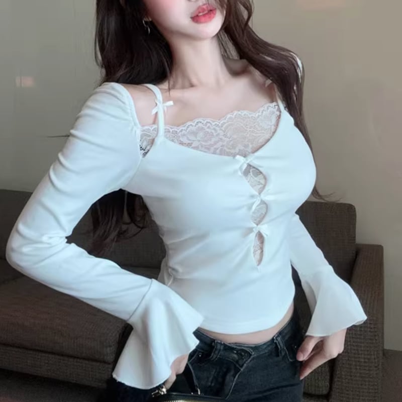 ribbon long sleeve lace cropped cutout top m1597