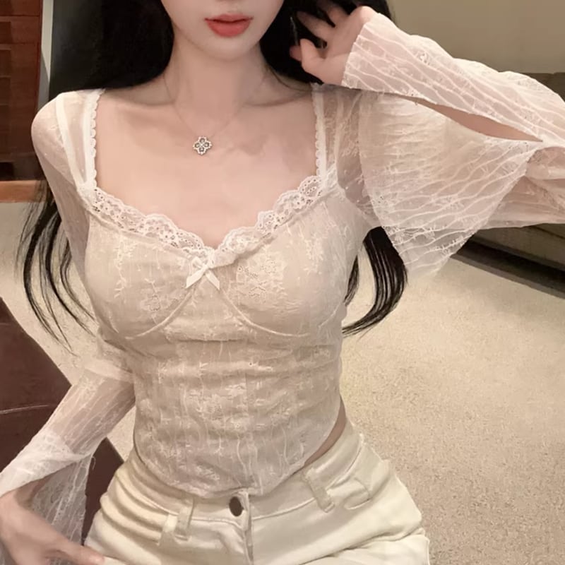 lace long sleeve cropped pullover cut sew m1605