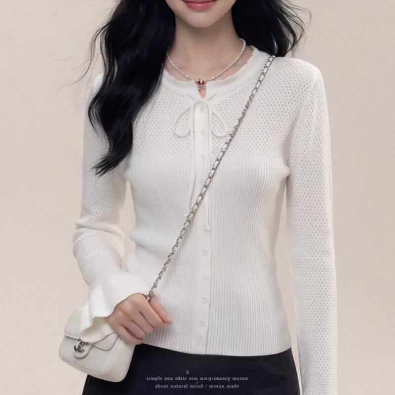 リボンがアクセントの長袖リブニットカーディガン。コンパクトなシルエットで、様々なスタイリングに合わせやすい一枚です。普段使いはもちろん、少し上品な装いにもマッチします。