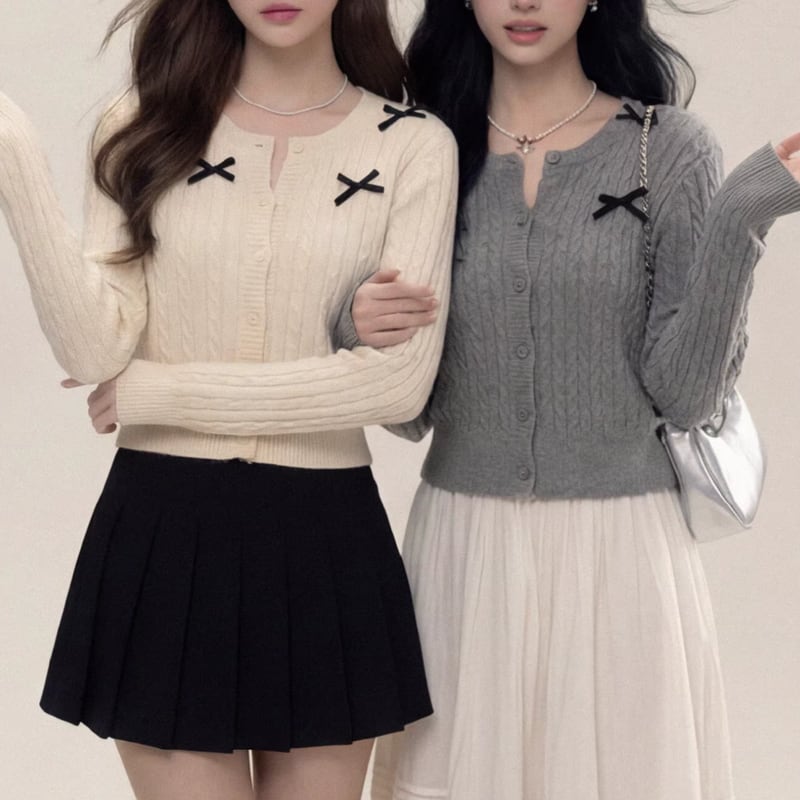 ribbon long sleeve cropped knit cardigan set m1648