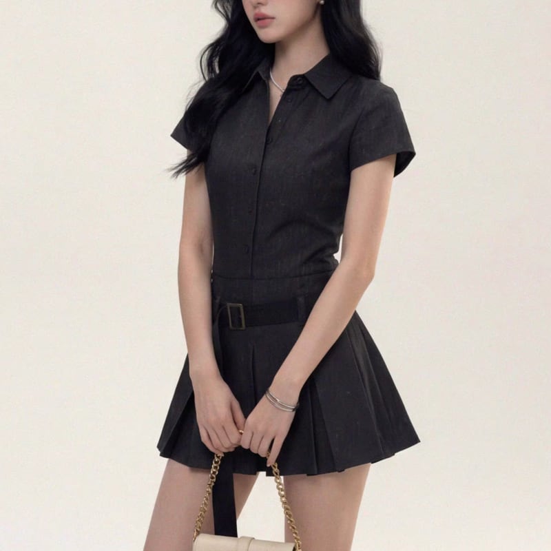 shirt color short sleeve belted mini one-piece m1655