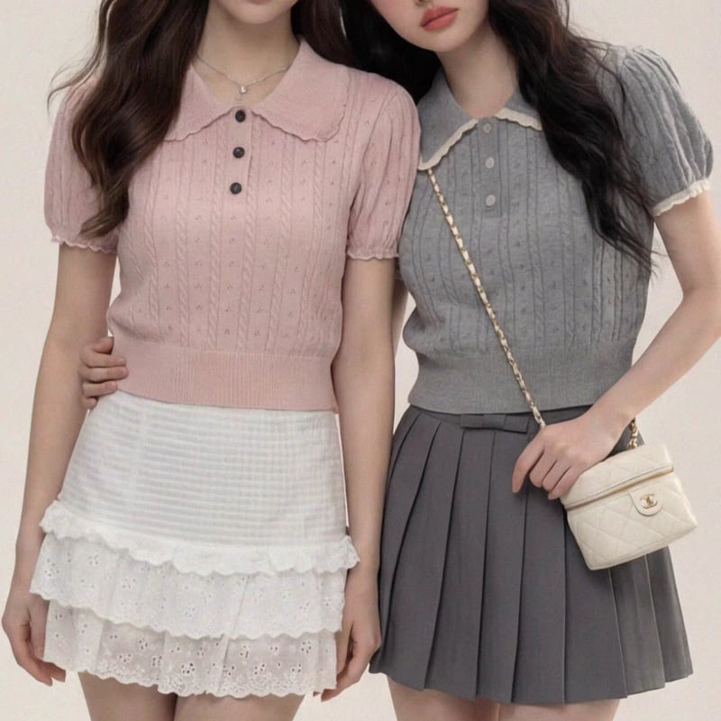襟元のデザインが特徴的な、ショートスリーブのクロップドニットポロシャツです。カジュアルながらも上品な印象を与え、普段使いから少し特別な日まで、幅広いシーンで活躍します。コンパクトな丈感なので、ハイウエストのボトムスと合わせるとスタイルアップ効果も期待できます。