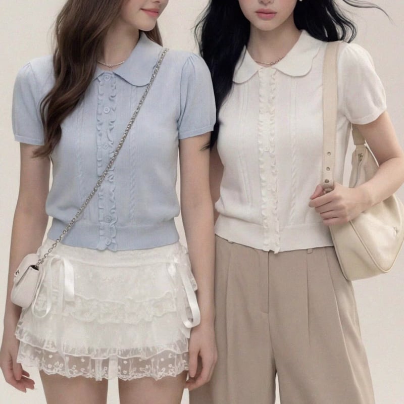フリルがあしらわれた襟元が特徴的な半袖ニットポロシャツ。