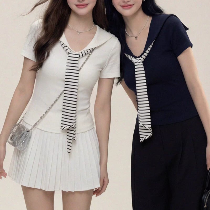 sailor collar short sleeve ribbed knit polo shirt m1660