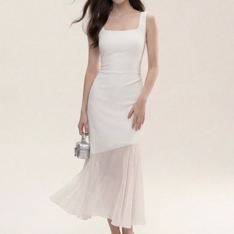 美しいシルエットを描くノースリーブミディドレス。スクエアネックがデコルテをすっきりと見せ、さりげなく女性らしさを演出します。裾のマーメイドラインが、歩くたびにエレガントな印象を与え、特別な日の装いにもぴったりです。アクセサリーや小物で個性をプラスして、自分らしい着こなしを楽しめます。