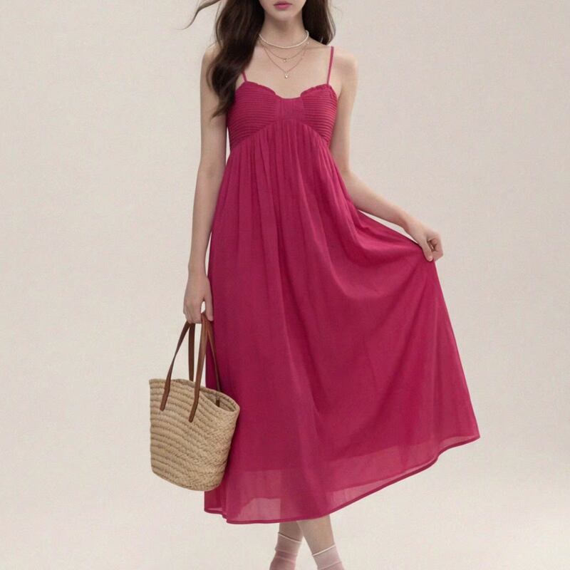 リラックスムードを演出する、Aラインのミディドレス。キャミソールタイプで、肩まわりを華奢に見せてくれます。普段使いはもちろん、ちょっとしたお出かけにも最適です。