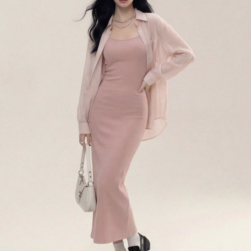 long-sleeve open color midi-length shirt & one-piece set-up m1667