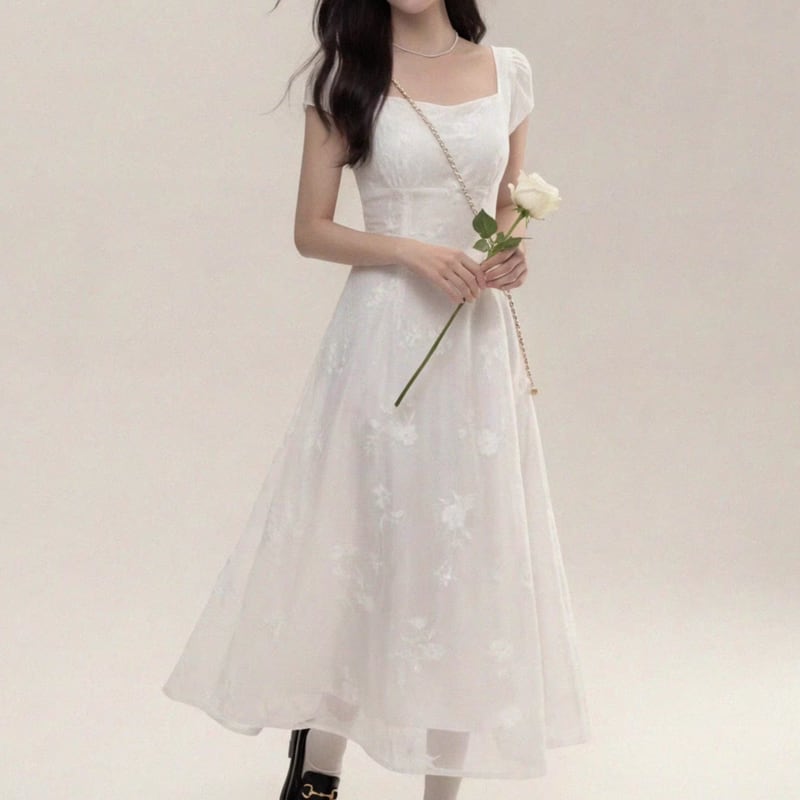 ふんわりとしたパフスリーブと、清楚なAラインシルエットが魅力のミディ丈ワンピース。