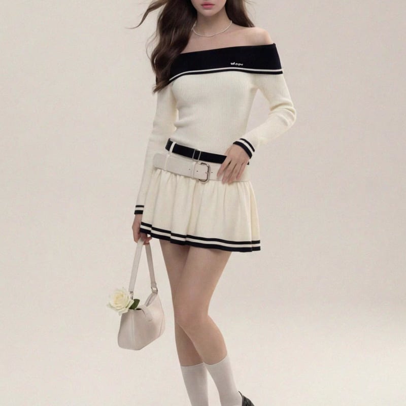 long sleeve border mini-length ribbed knit one-piece m1684