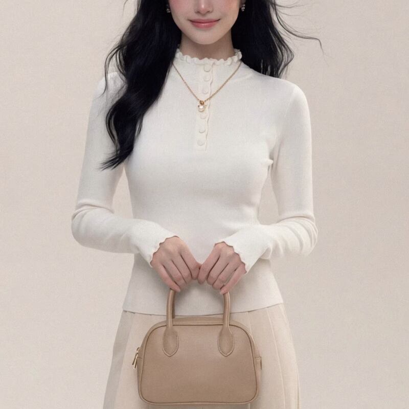 襟元のフリルとボタンのデザインが、さりげない可愛らしさをプラスします。