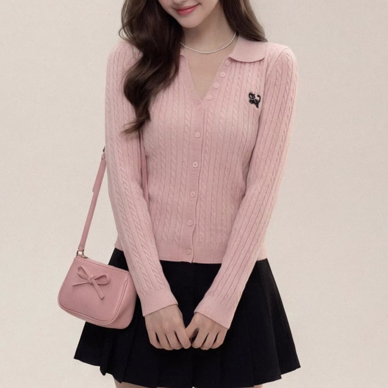 上品な印象を与える、長袖のニットポロシャツ。オープンカラーのデザインが、首元をすっきりと見せてくれます。フロントボタンなので、カーディガンとしても着用可能。オフィススタイルにはもちろん、カジュアルな装いにも合わせやすいアイテムです。