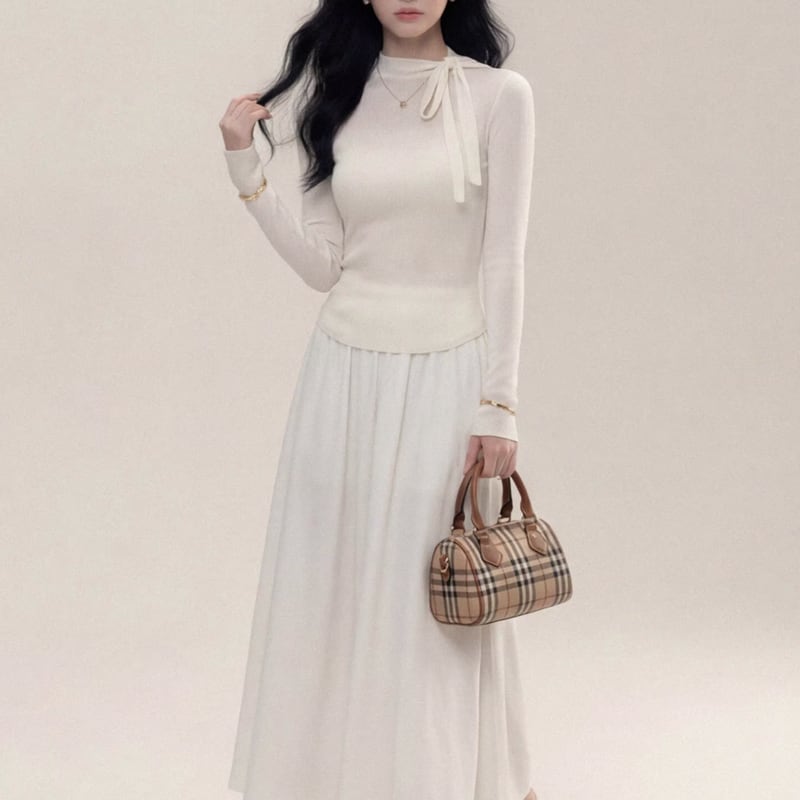 上品な印象を与える長袖ニット。首元のリボンは、結び方によって様々な表情を演出できます。シンプルなボトムスと合わせるだけで、洗練されたコーディネートが完成します。