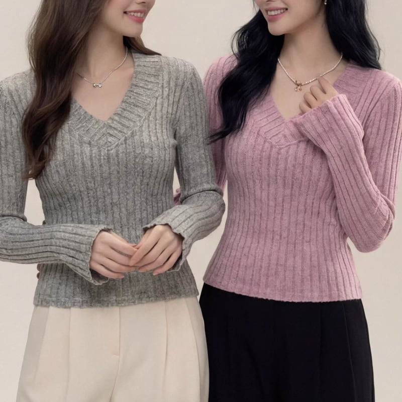 long sleeve v-neck ribbed knit pullover m1701