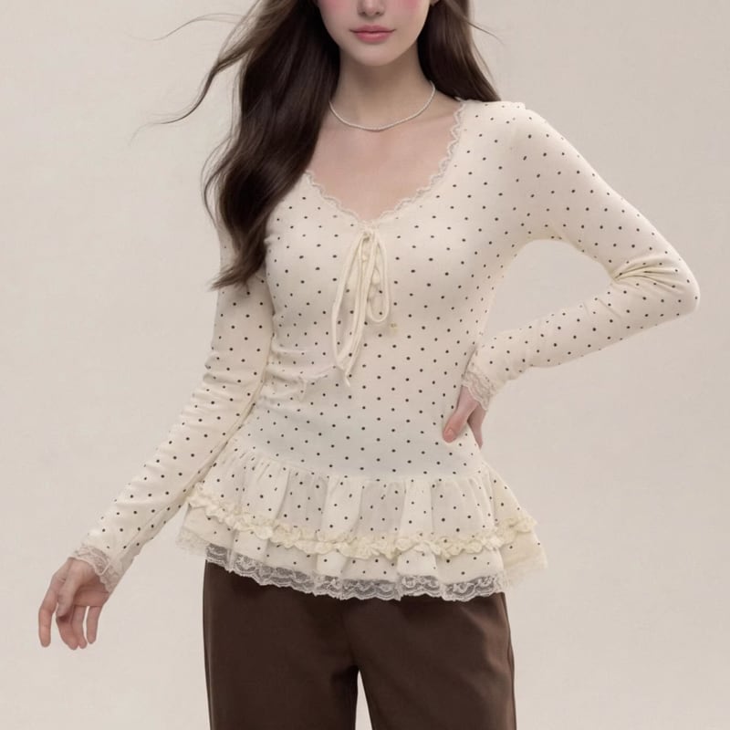 可愛らしいドット柄が目を引くトップス。裾のペプラムがポイントで、コーディネートに華やかさをプラスします。普段の着こなしに取り入れるだけで、おしゃれ度がアップするアイテムです。