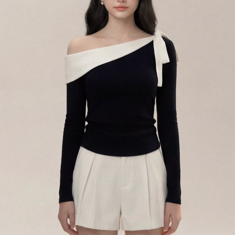 上品な肌見せが叶う、オフショルダーニットトップス。肩にあしらわれたリボンが、さりげないアクセントになっています。シンプルなデザインなので、どんなボトムスにも合わせやすいのが魅力。デニムと合わせてカジュアルに、スカートと合わせてフェミニンにと、様々なスタイリングを楽しめます。