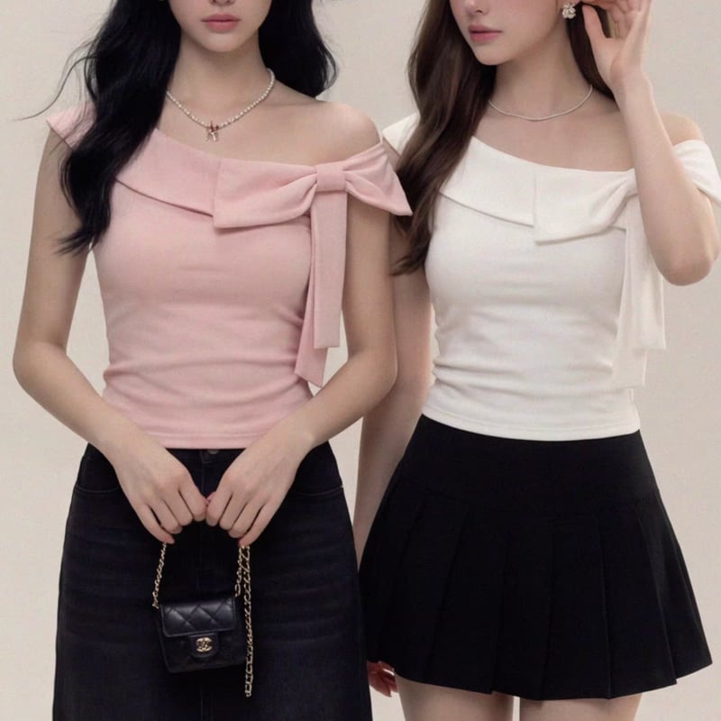 アシンメトリーなデザインが目を引くノースリーブトップス。リボンがアクセントとなり、スタイリングに華やかさをプラスします。普段使いはもちろん、ちょっとしたお出かけにもおすすめです。