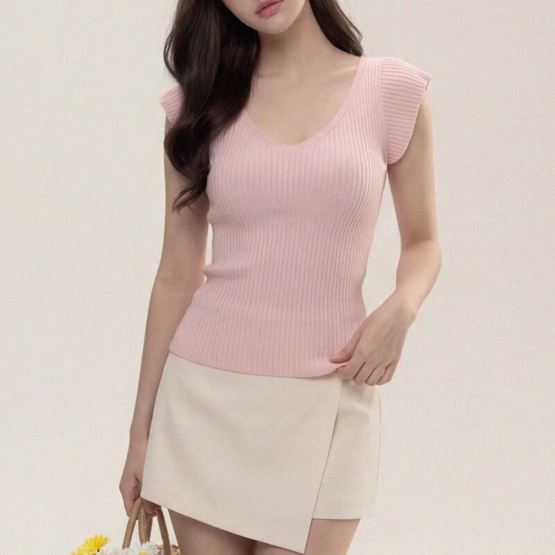 程よいVネックラインがデコルテを美しく見せてくれるノースリーブニット。リブ編みで縦のラインを強調し、すっきりとした印象を与えます。カジュアルな普段使いにはもちろん、オフィスや、少し上品な装いにも合わせやすいアイテムです。
