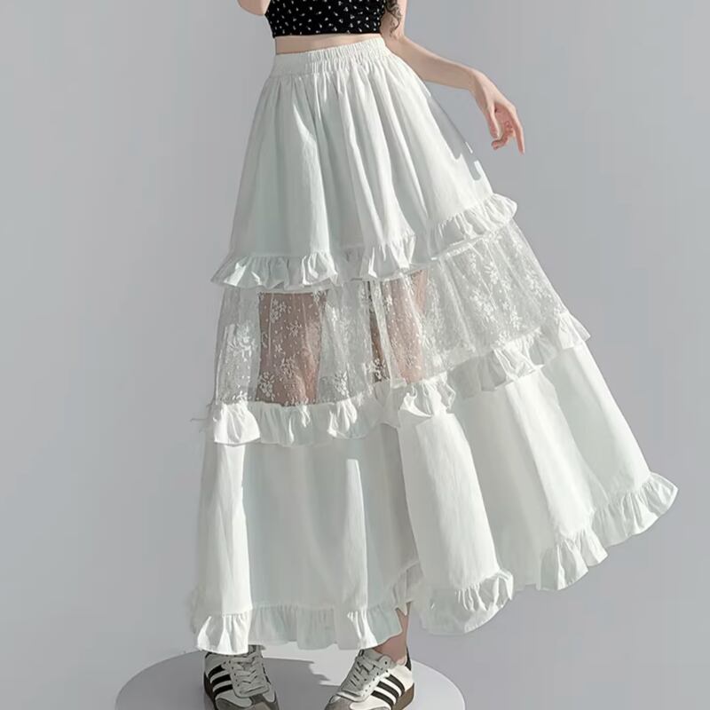 ティアードデザインが目を引くマキシスカート。フリルとレースの切り替えが、フェミニンな印象を与えます。普段使いはもちろん、リゾートシーンにもおすすめです。
