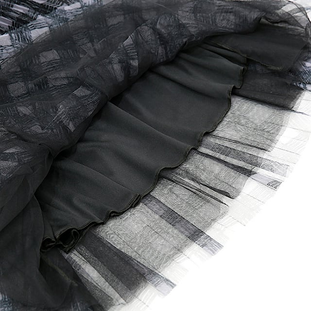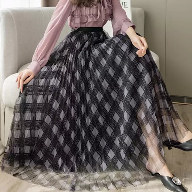 チェック柄のAラインチュールスカート 。レースで抜け感が出てふんわりとした柔らかいデザインです。