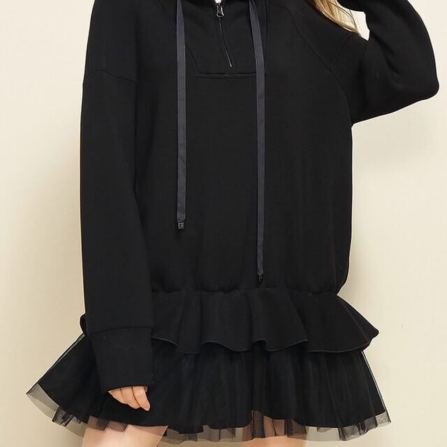 クラシカルなフリルが可愛らしいフード付きのパーカーワンピーススポーティーな印象を与えるフーディーを、裾のチュールフリルがガーリーな大人可愛いを演出。